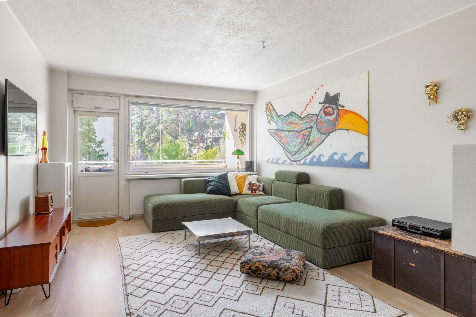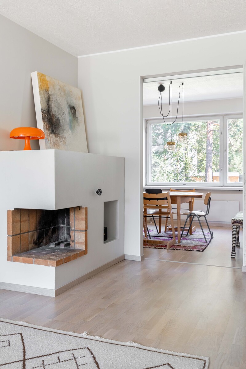 Olohuoneessa on takka tunnelmaan luomaan. Olohuoneesta on myös kulku lasitetulle eteläparvekkeelle. Parvekkeelta on vehreät näkymät pihalle ja puistoon.