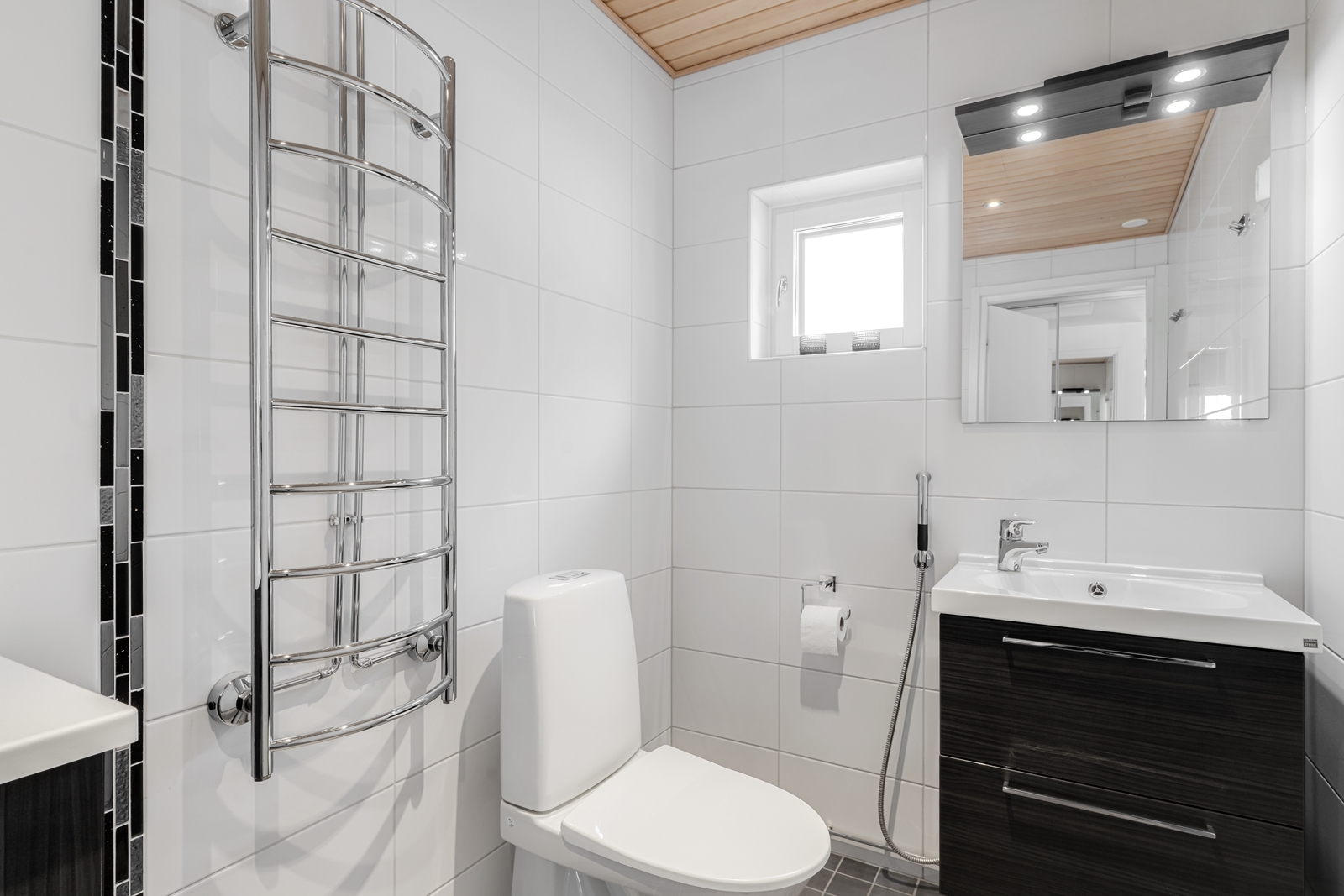 | Kylpyhuoneen kuvaus | Pesukoneliitäntä, lattialämmitys, suihkuseinä, peilikaappi, allaskaappi, suihku, wc-istuin ja kiinteät valaisimet, seinät (kaakeli), lattiat (laatta), Alakerrassa on kylpyhuone, yläkerrassa on saunan yhteydessä pesuhuone. |
