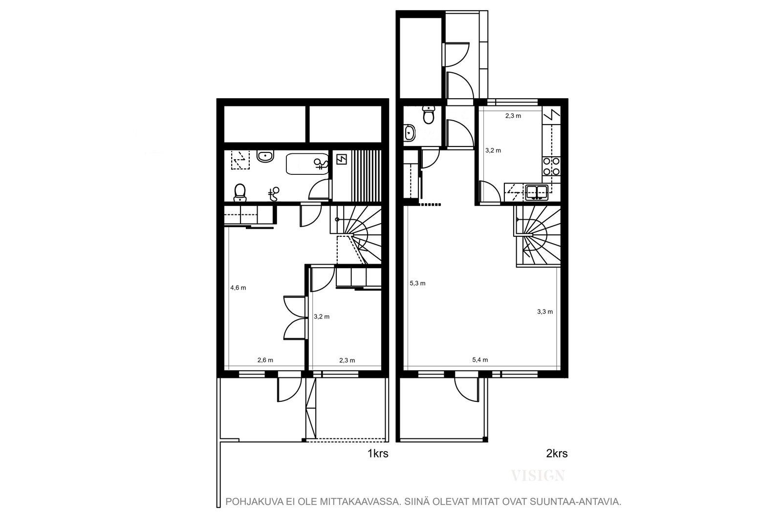 Laatta: erillinen wc, alakerta huone ja aula, kylpyhuone ja sauna