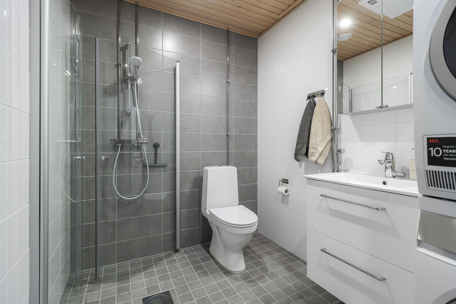 Pesukoneliitäntä, suihkukaappi, lattialämmitys, peilikaappi, allaskaappi, suihku, wc-istuin ja kiinteät valaisimet, seinät (kaakeli), lattiat (laatta), bideesuihku, pikkukaappi |