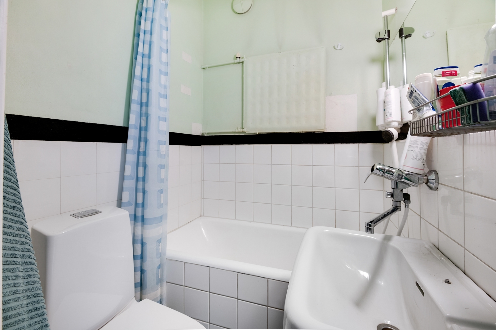 | Kylpyhuoneen kuvaus | Peili, kylpyamme, suihku ja wc-istuin, seinät (kaakeli), lattiat (laatta) |
