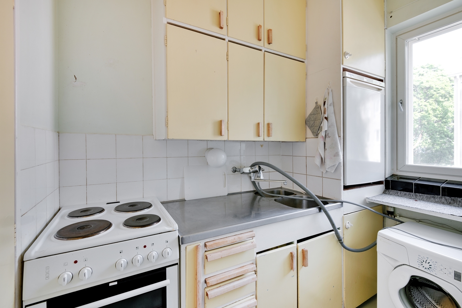 | Keittiön kuvaus | Liesi (sähköliesi), seinät (maali), lattiat (lauta), liesi ja jääkaappi |