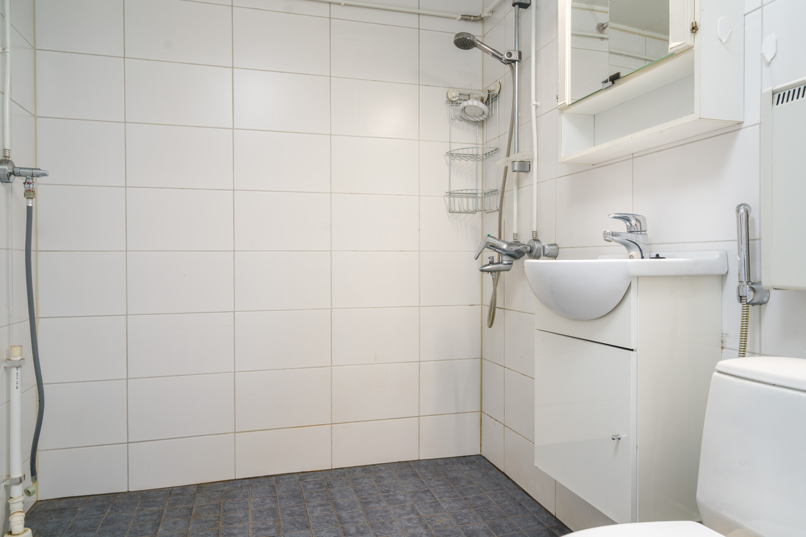 WC-istuin, pesukoneliitäntä, peilikaappi ja suihku, seinät (kaakeli), lattiat (laatta) |
