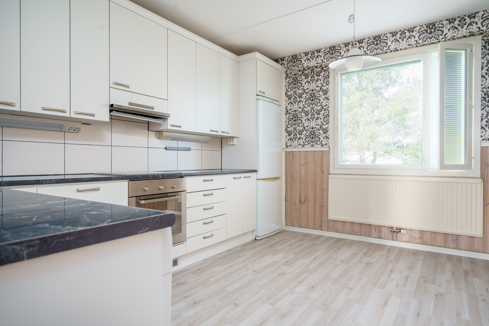 Liesi (erillisuuni, liesitaso), työtasot (laminaatti), seinät (tapetti ja puolipaneeli, osalaatoitus), lattiat (laminaatti), jääkaappipakastin, astianpesukone, erillisuuni, liesituuletin ja liesitaso |