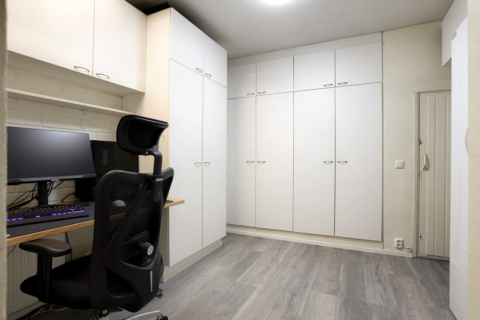 | Kodinhoitohuoneen kuvaus | Pöytätaso, pesukoneliitäntä, pyykkikaapit, silityspöytä/taso ja lattialämmitys, lattiat (laatta), seinät (puu) |