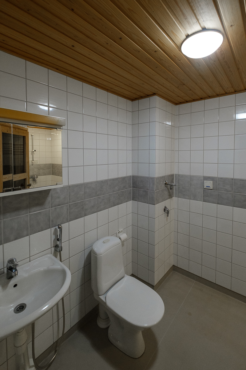 WC-istuin, suihku, pesukoneliitäntä, lattialämmitys, peilikaappi, pesuallas, allaskaappi ja bidee-suihku, seinät (kaakeli), lattiat (muovimatto) |