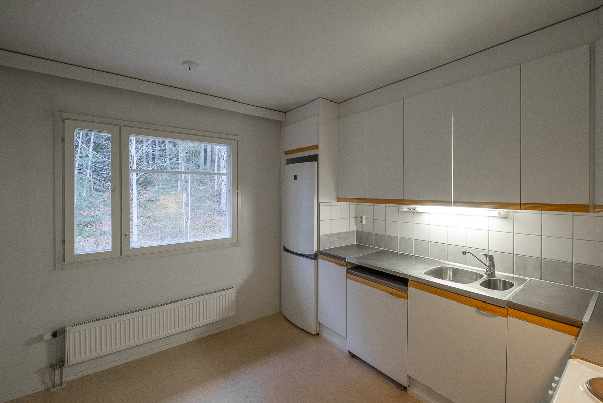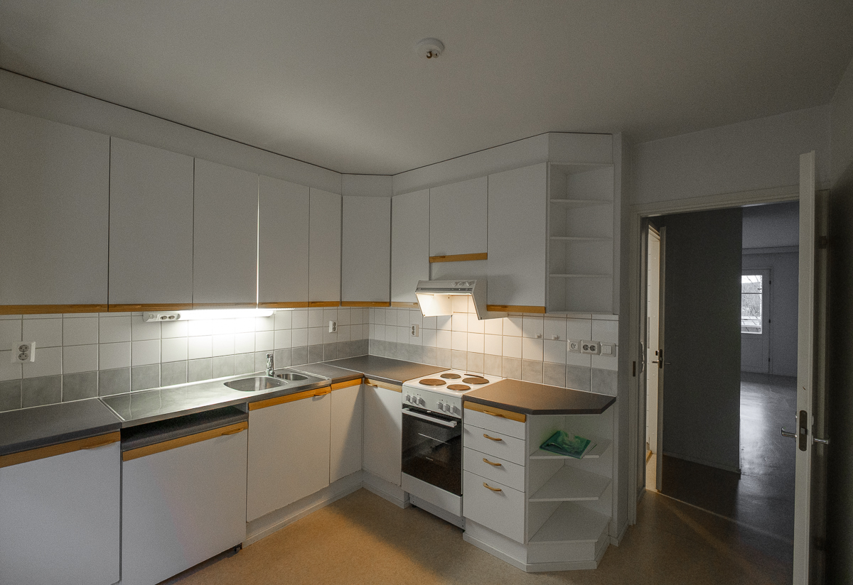 Liesi (Sähköhella), työtasot (laminaatti), seinät (maali), lattiat (muovimatto), liesi, liesituuletin ja jääkaappipakastin |