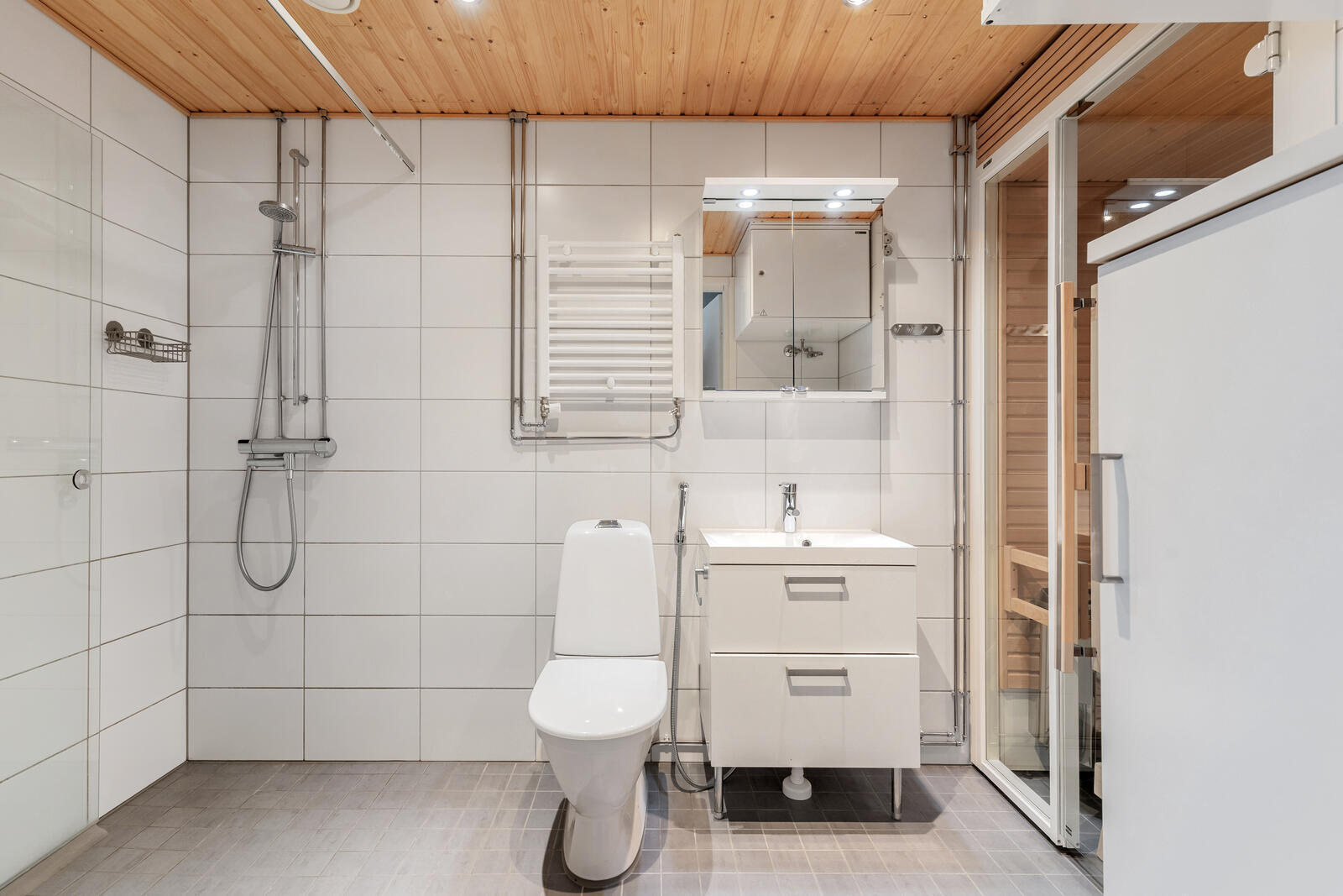 | Kylpyhuoneen kuvaus | Allaskaappi, lattialämmitys, peilikaappi, suihku, pesukoneliitäntä, suihkuseinä, wc-istuin ja kiinteät valaisimet, seinät (kaakeli), lattiat (laatta) |