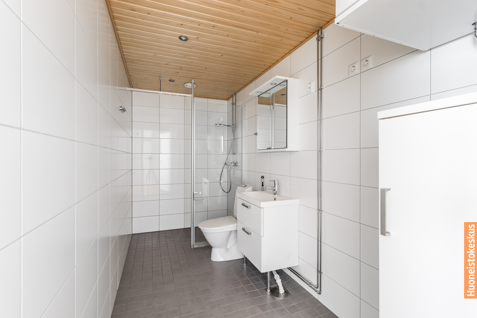 | Kylpyhuoneen kuvaus | Pesukoneliitäntä, suihkuseinä, wc-istuin, allaskaappi, peilikaappi, suihku ja kiinteät valaisimet, seinät (kaakeli), lattiat (laatta) |