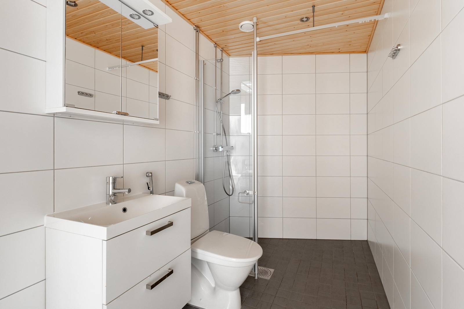 | Kylpyhuoneen kuvaus | Peilikaappi, suihkuseinä, wc-istuin, suihku ja lattialämmitys, seinät (kaakeli), lattiat (laatta), bidee |
