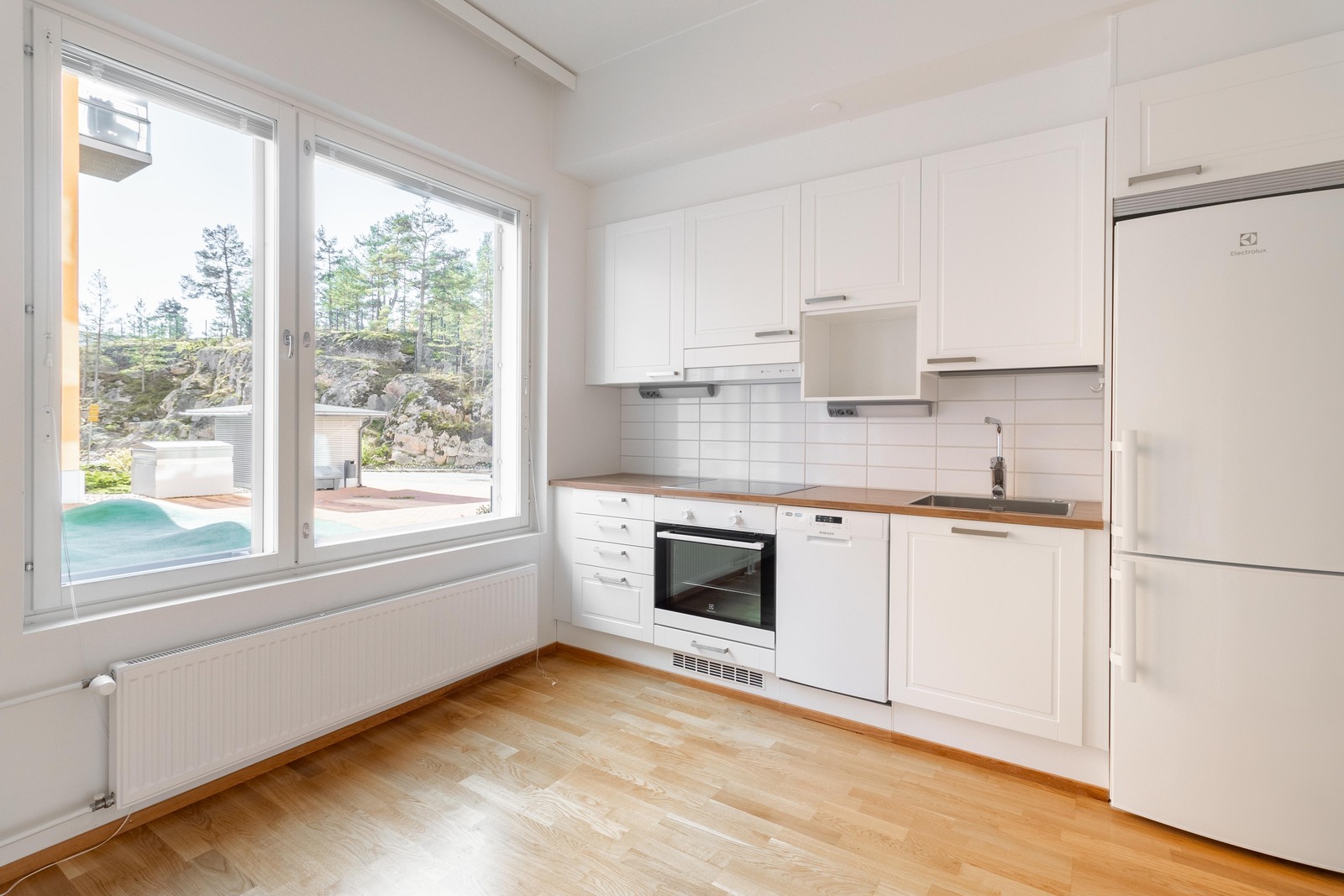 | Keittiön kuvaus | Liesi (erillisuuni, liesitaso), työtasot (laminaatti), seinät (maali), lattiat (parketti), jääkaappipakastin, erillisuuni, liesituuletin, astianpesukone ja kiinteät valaisimet, liesitaso, keittiön välitila: laatta, valkoiset kaapistot |