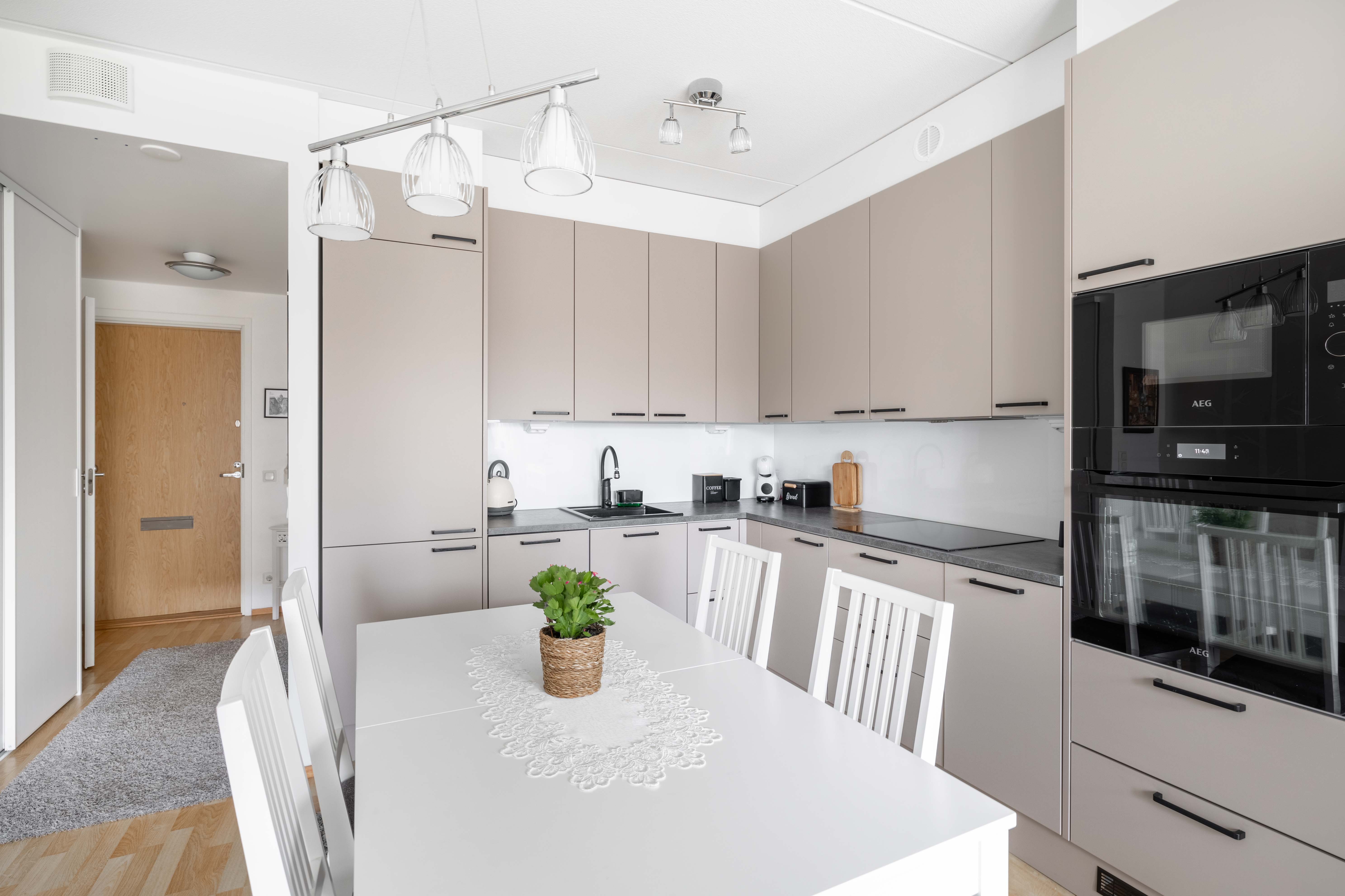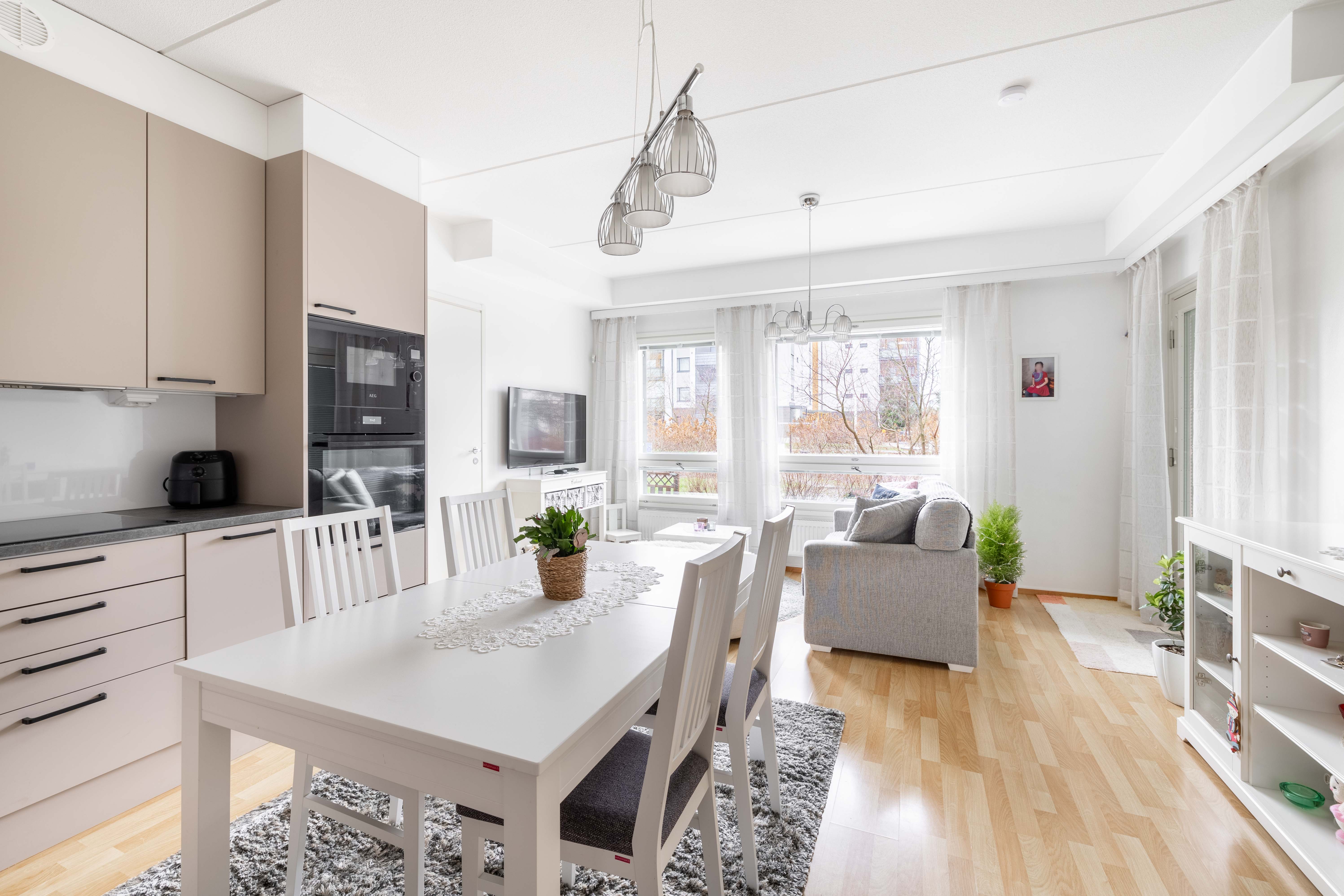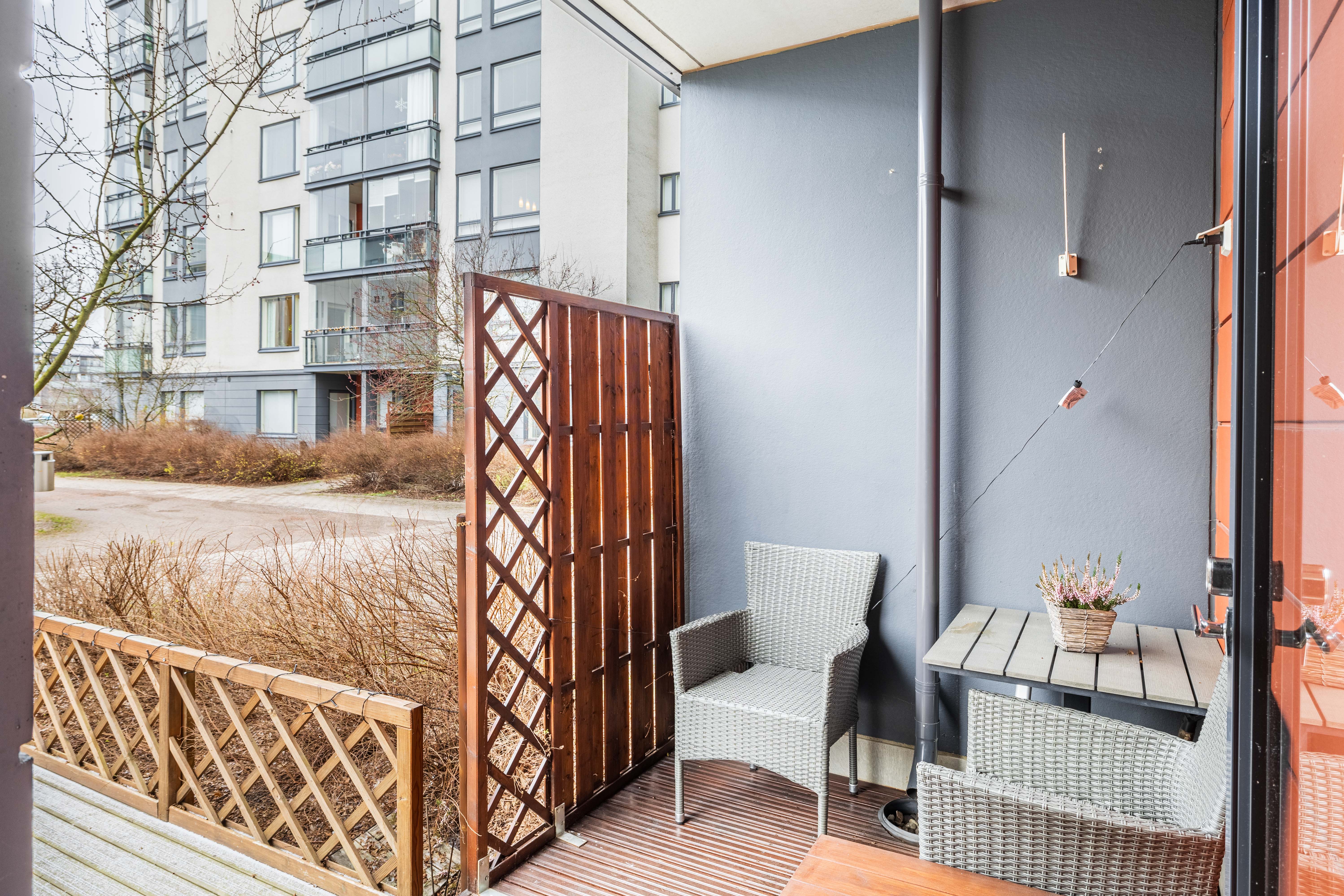 Keittiö ja olohuone ovat yhtenäistä avaraa tilaa, moderni keittiö on remontoitu vuonna 2024. Olohuoneesta on käynti hyvän kokoiselle terassille ja asunnon yhteydessä olevalle piha-alueelle. Terassia on laajennettu vuonna 2019, jolloin piha-alue on saanut portin sekä istutuksia.