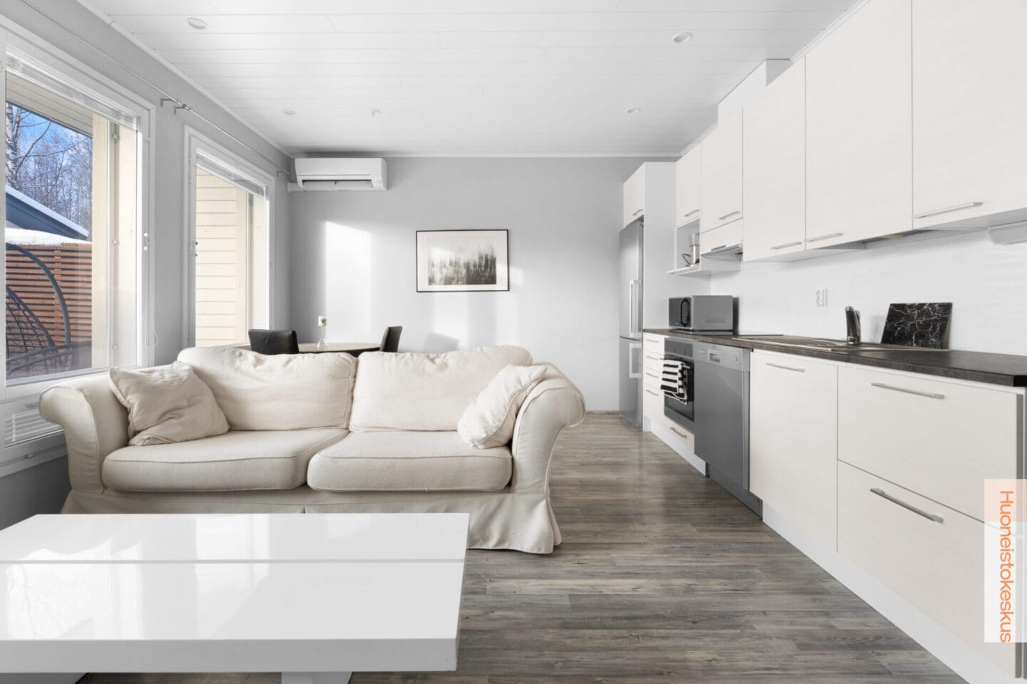 Karhunmäen alkuosasta tarjolla rivitaloyhtiön saunallinen kaksio. Nykyaikainen ja vaalein pintamateriaalein toteutettu asunto tarjoaakin seuraaville asukkaille muuttovalmiin ja huolettoman kokonaisuuden pitkälle tulevaisuuteen. Olohuoneen yhteydestä käynti takapihan suojaisalle terassille. Makuuhuoneesta löydätkin kiintokaapistot kodintekstiileille ja lisäsäilytystilaa avautuu eteistilan yhteydestä. Kaakelipinnoin varustettu kylpyhuone pesukoneliitännällä varustettuna sekä sauna odottamassa seuraavaa löylyttelijää saapuvaksi.