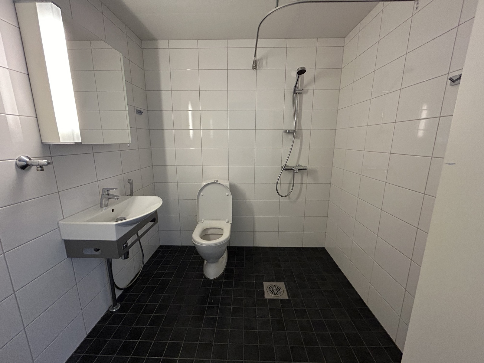 Pesukoneliitäntä, wc-istuin, allaskaappi, lattialämmitys, peilikaappi, suihku ja kiinteät valaisimet, seinät (kaakeli), lattiat (laatta) |