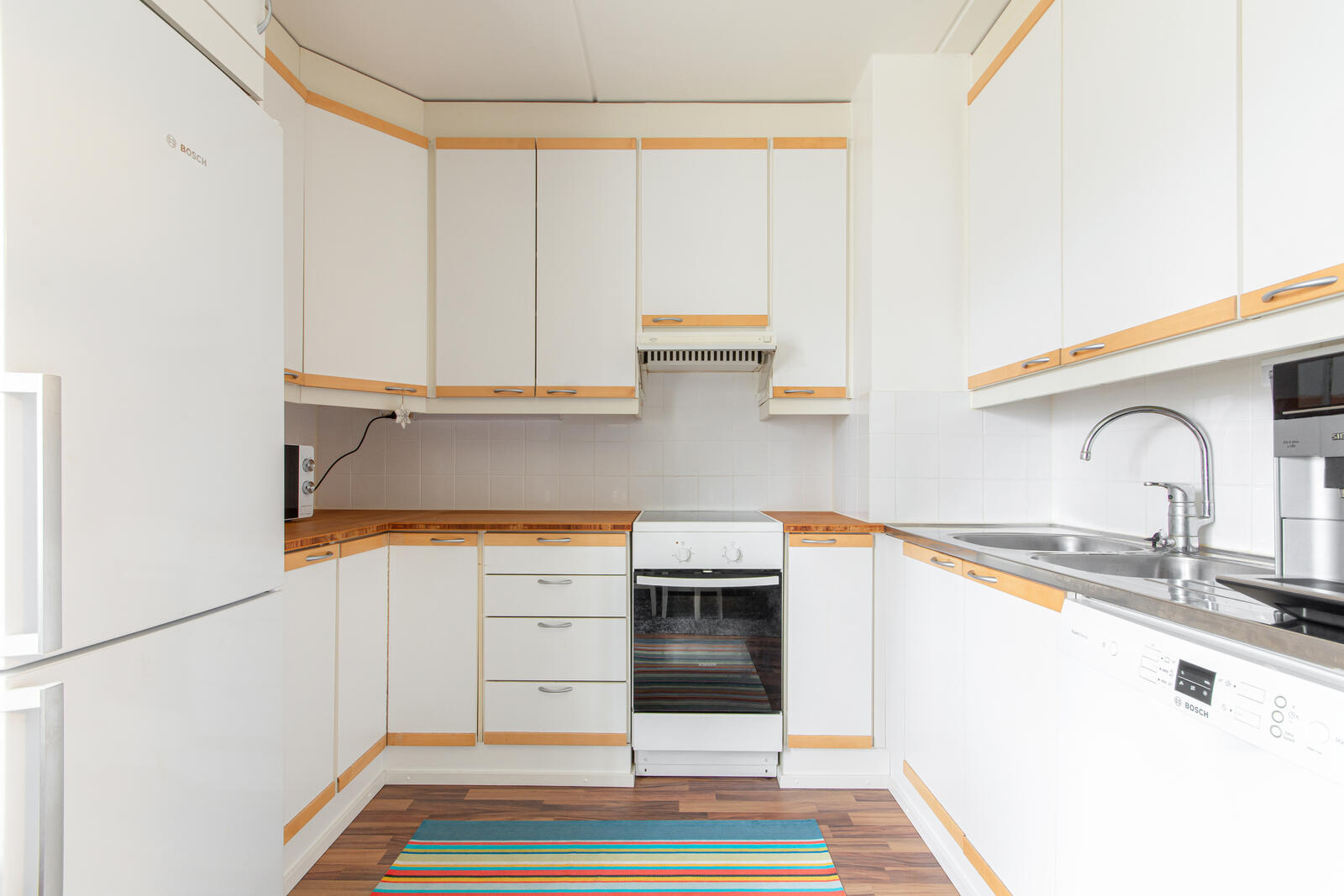 | Keittiön kuvaus | Liesi (Induktioliesi), seinät (maali), lattiat (laminaatti), astianpesukone, liesi ja jääkaappipakastin, valkoiset kaapistot ja välitilalaatat, puutasot |