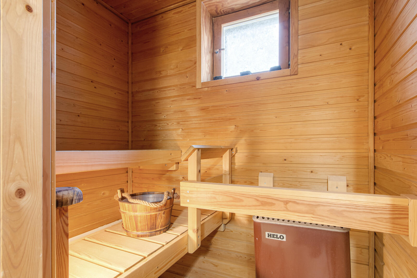 | Saunan kuvaus | Seinät (puolipaneeli), lattiat (muovi), Sähkökiuas, Helon kiuas. |