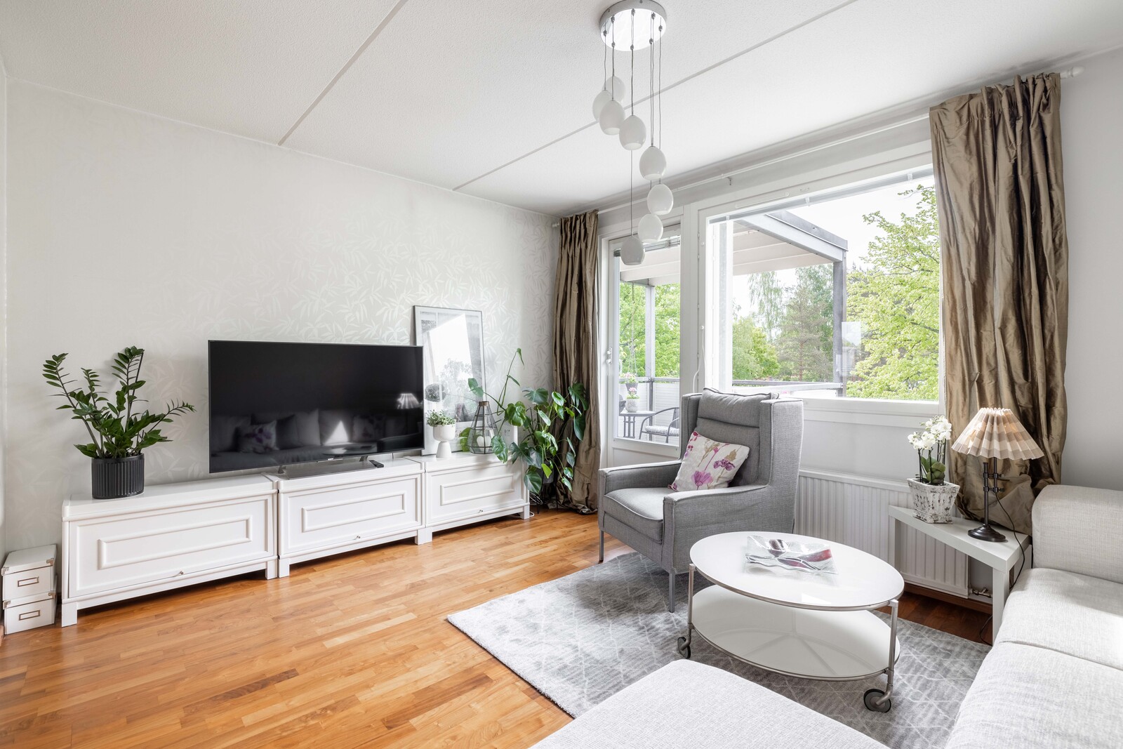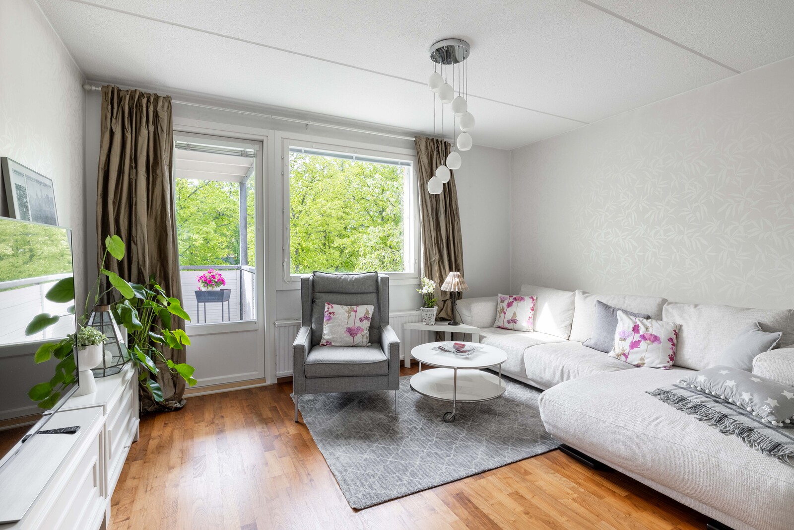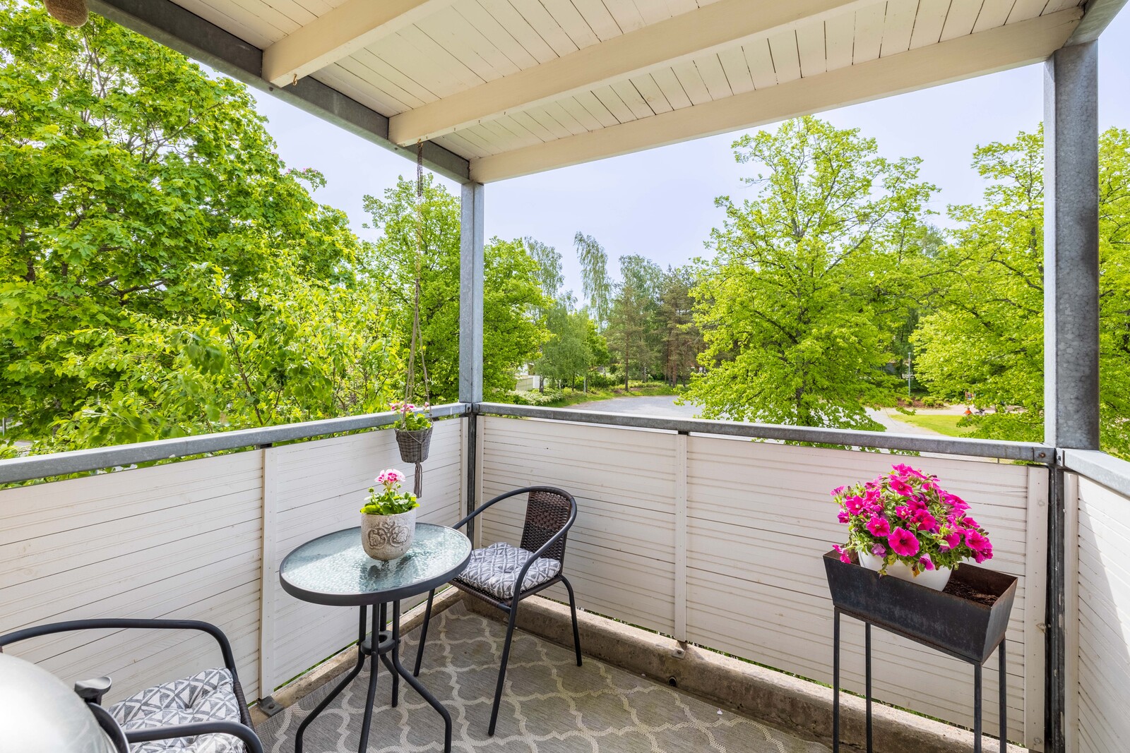 Huoneet ovat tilavia, säilytystilaa on runsaasti ja oman saunan lämmöistä pääset vilvoittelemaan eteläparvekkeelle puistonäkymiin.