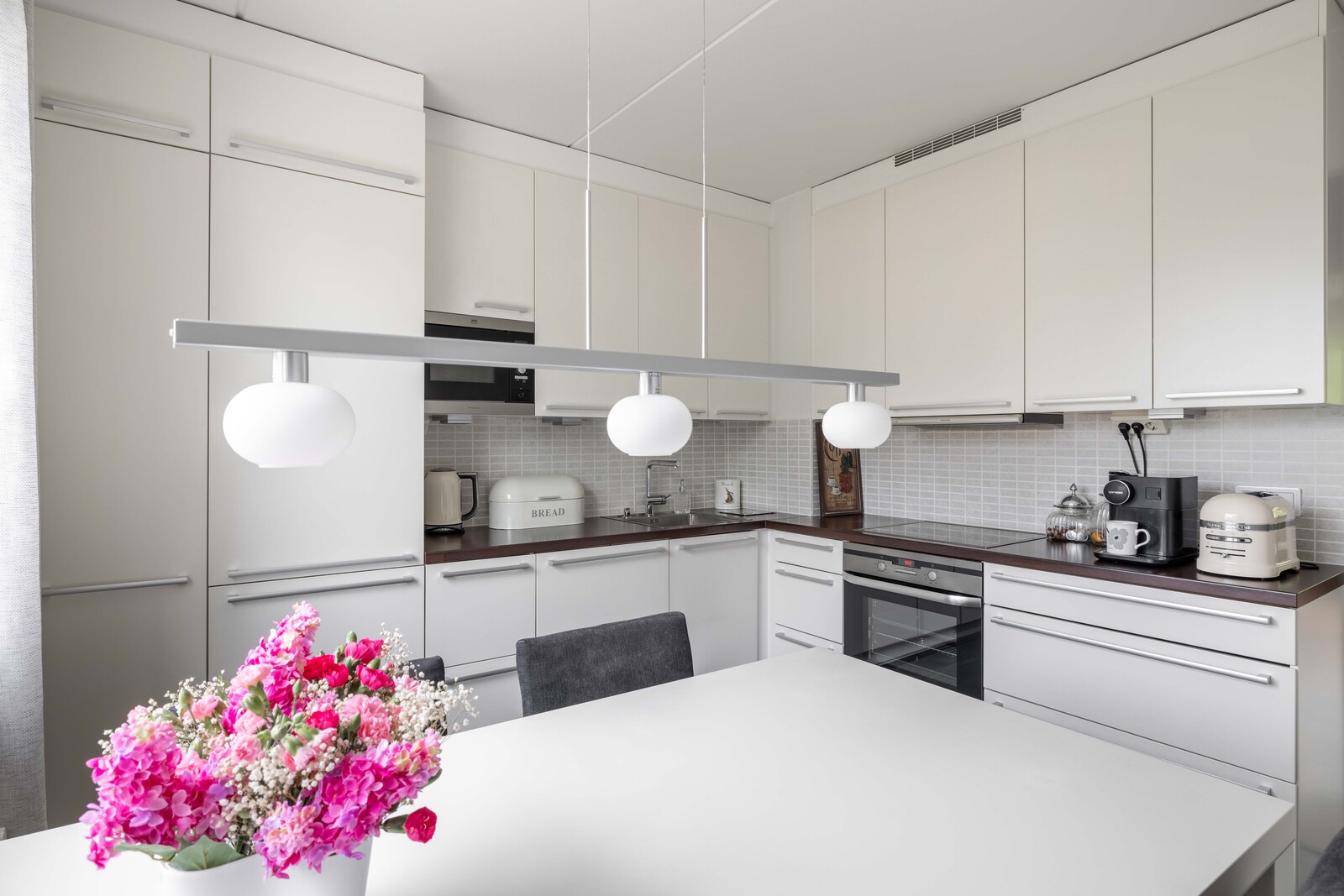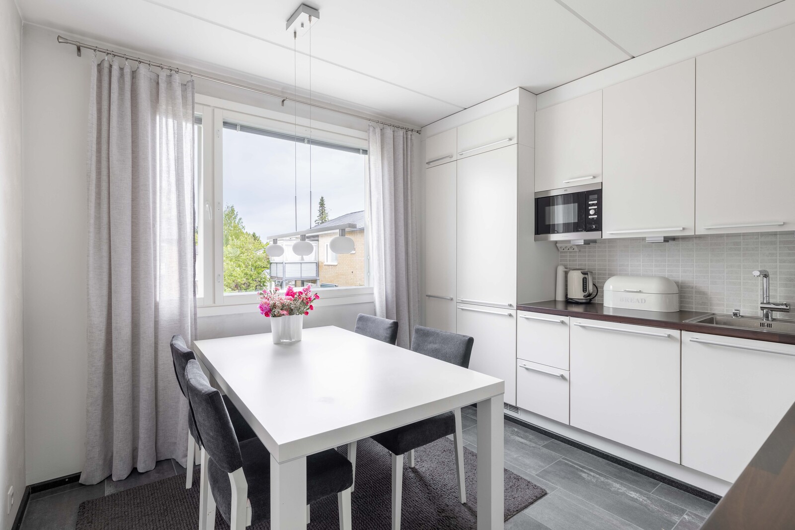 Iso keittiö kutsuu kokkailemaan, pöydän ympärille mahtuu isompikin ystäväjoukko iltaa istumaan.
