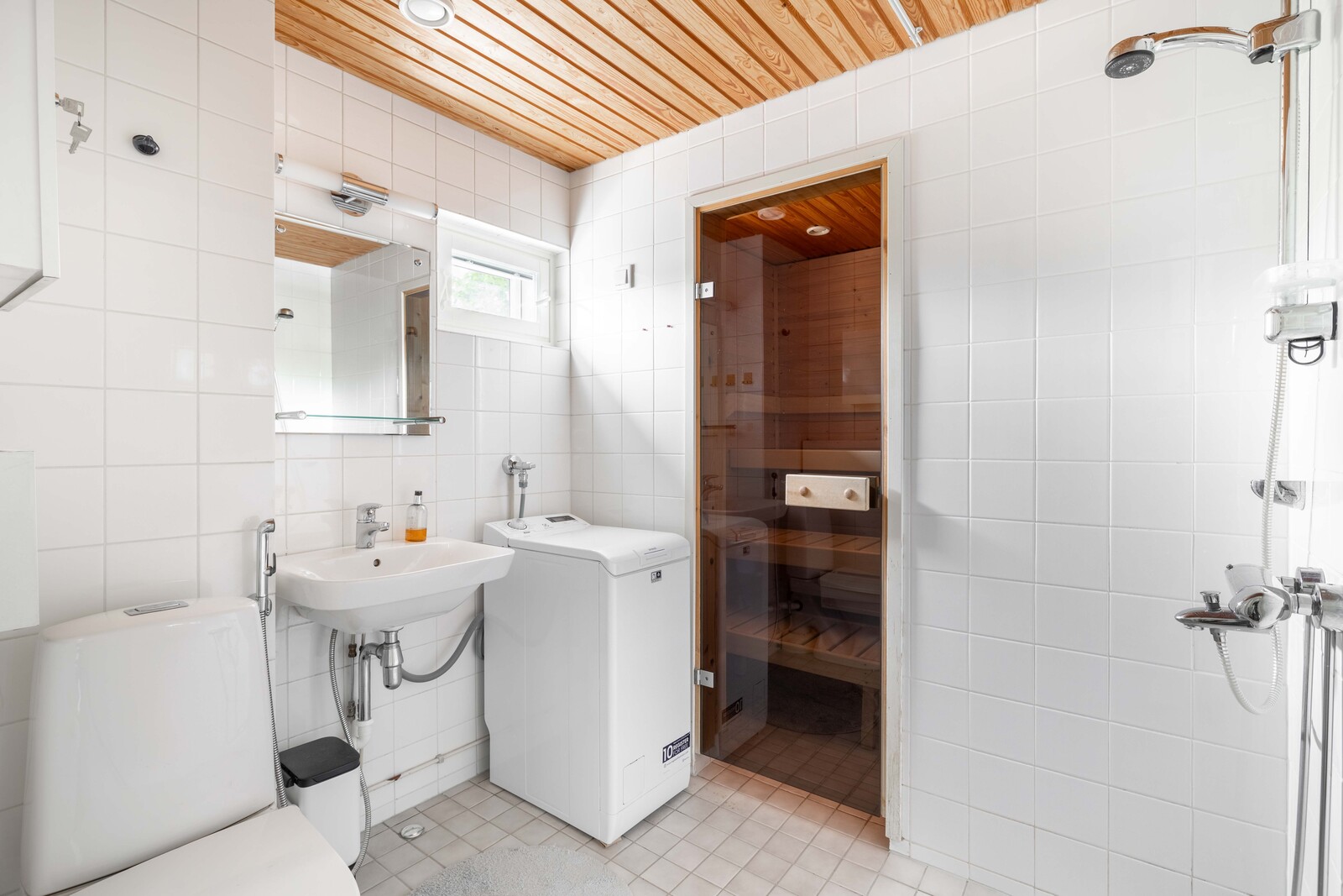 | Kylpyhuoneen kuvaus | Lattialämmitys, wc-istuin, pesukoneliitäntä ja kiinteät valaisimet, seinät (kaakeli), lattiat (laatta) |