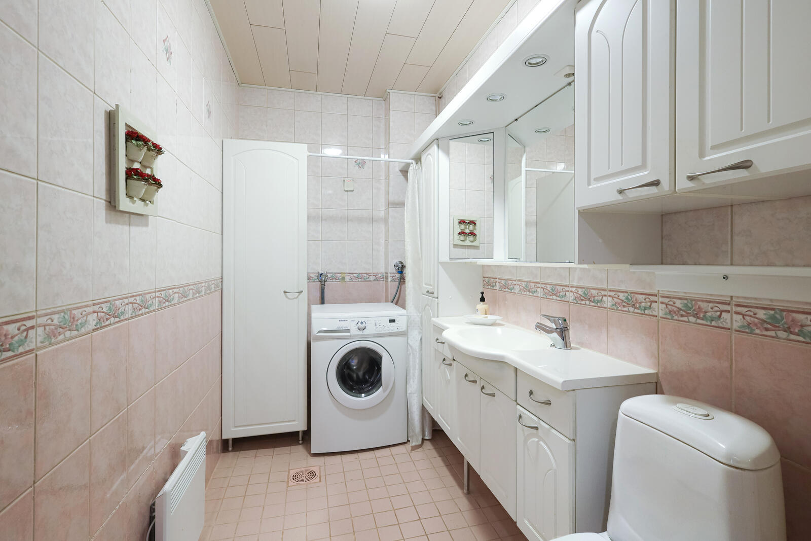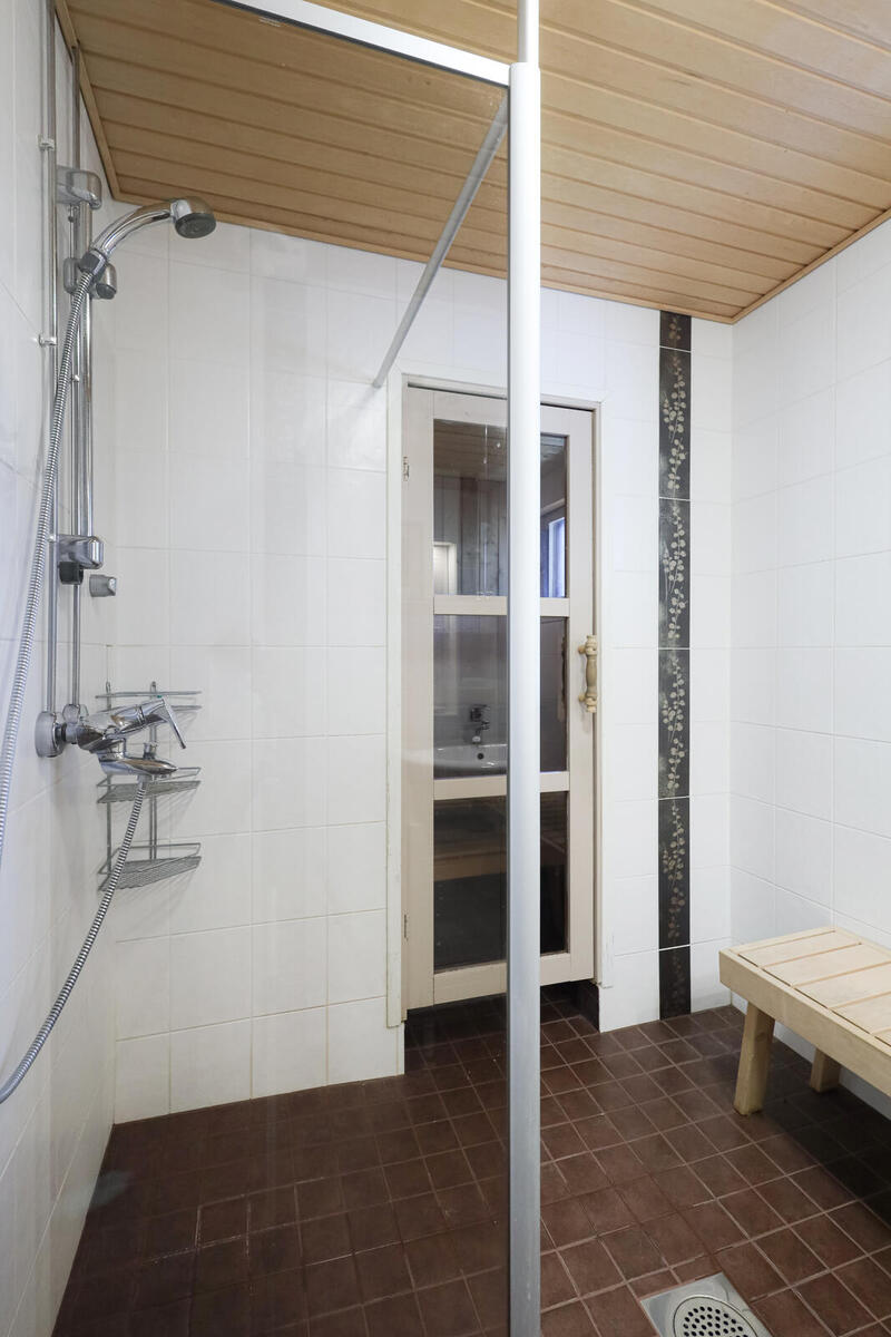 | Kylpyhuoneen kuvaus | Suihkuseinä, lattialämmitys, peilikaappi ja suihku, seinät (kaakeli), lattiat (laatta), Pesuhuone uusittu 2000-luvun alussa. |