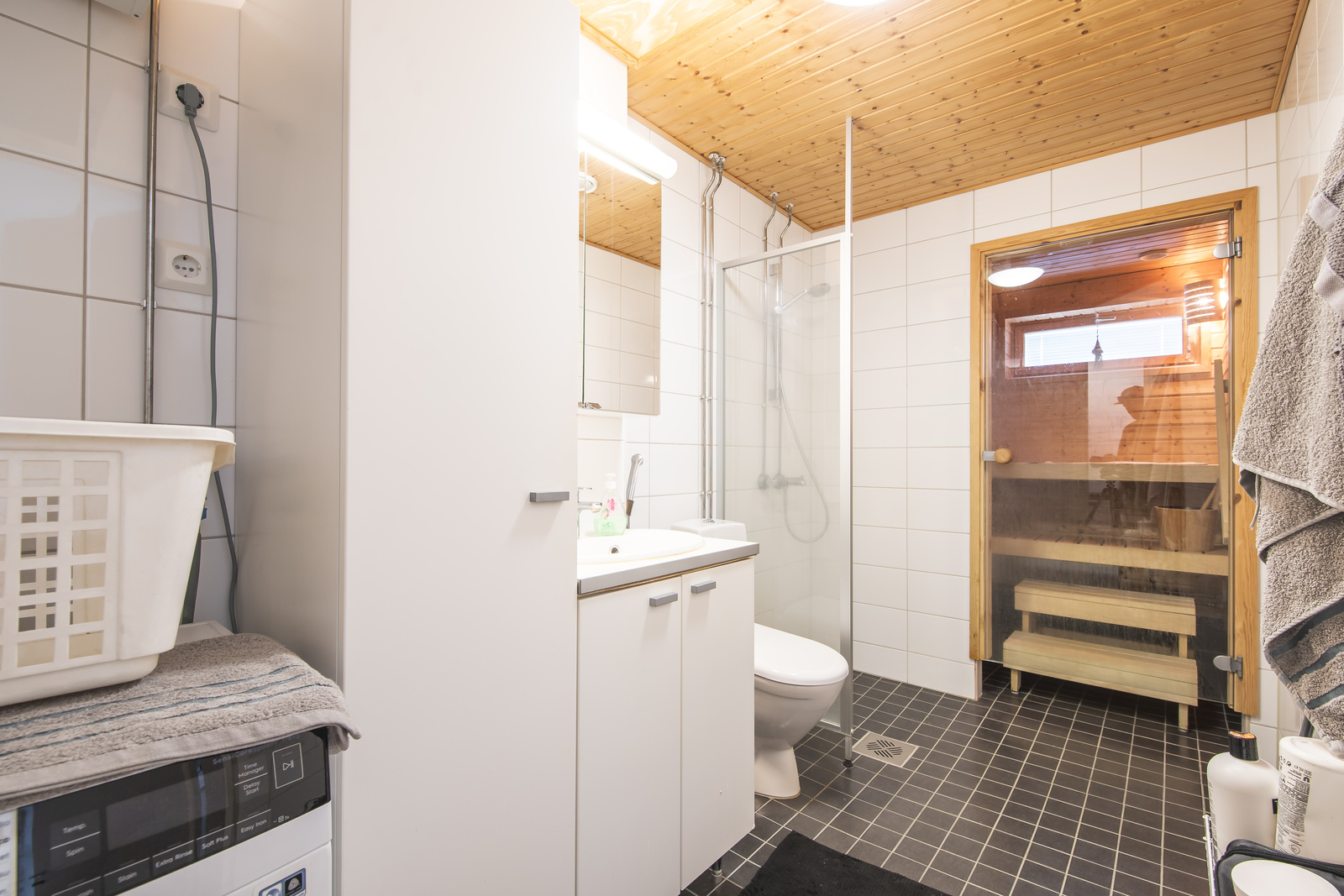 | Kylpyhuoneen kuvaus | Suihkuseinä, pesukoneliitäntä, wc-istuin, peilikaappi, suihku, allaskaappi, lattialämmitys ja kiinteät valaisimet, seinät (kaakeli), lattiat (laatta) |