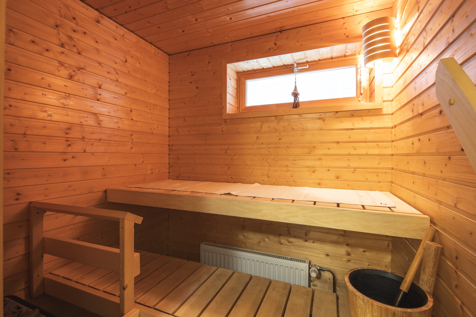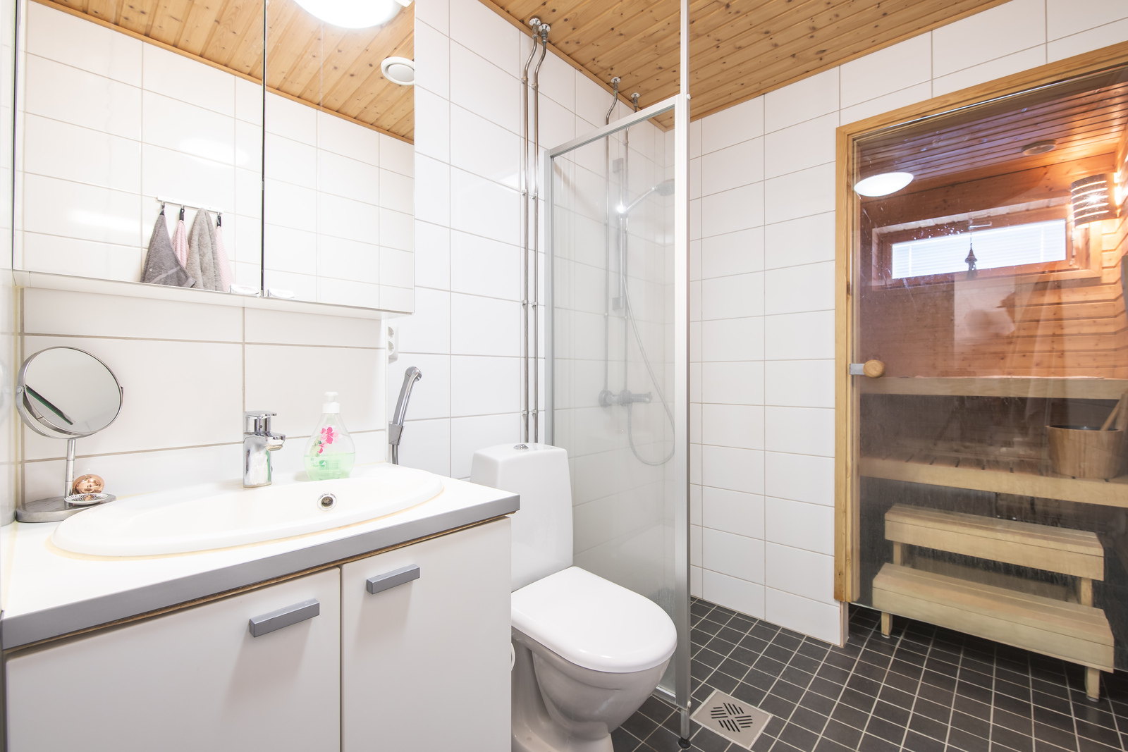 | Saunan kuvaus | Seinät (kaakeli), lattiat (laatta), Sähkökiuas |