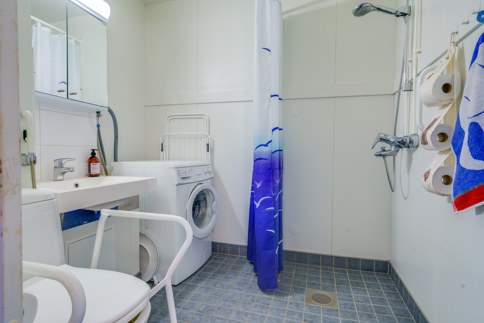 | Kylpyhuoneen kuvaus | Peilikaappi, pesukoneliitäntä, wc-istuin ja suihku, seinät (maali), lattiat (laatta) |