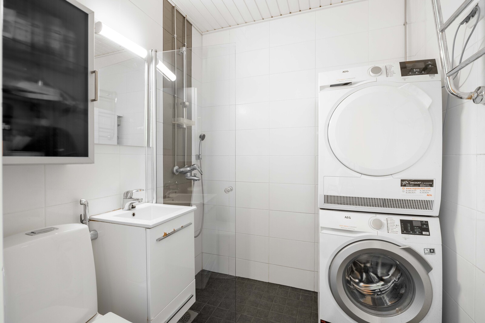 | Muuta kauppaan kuuluvaa | Pesukone ja kuivausrumpu. Lisätietoja sisältyvistä varusteista: kaapistot, kiinteät valaisimet, naulakko. |