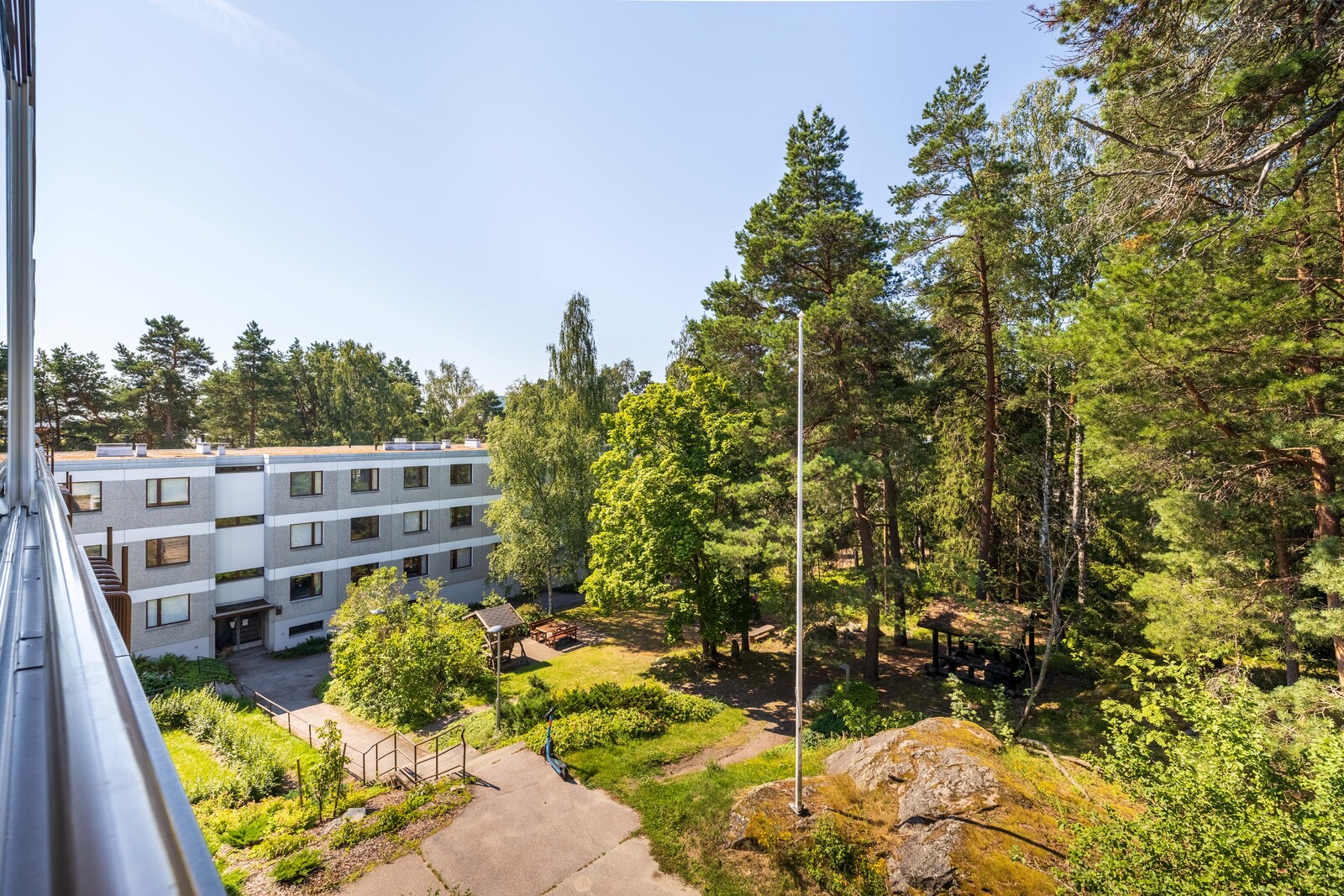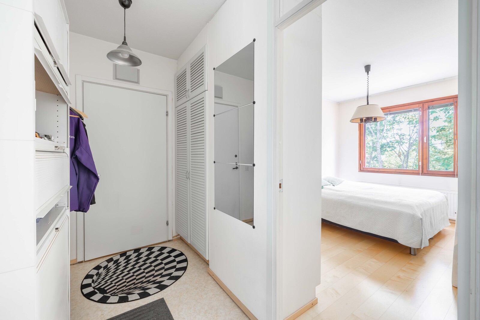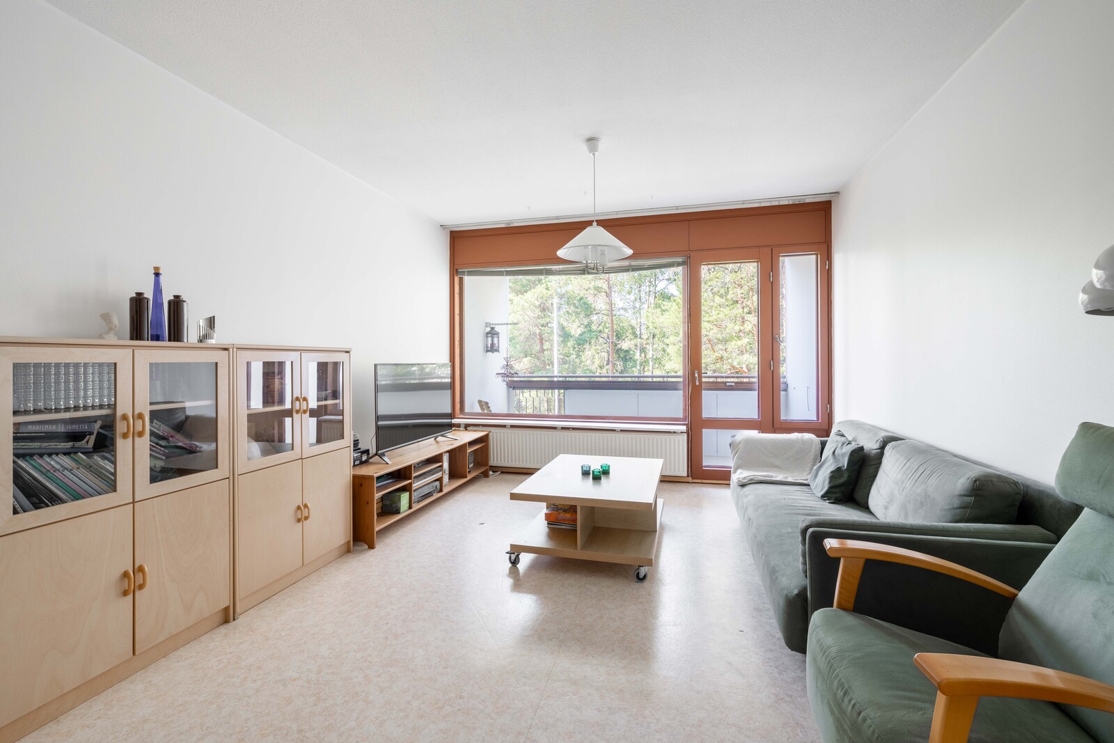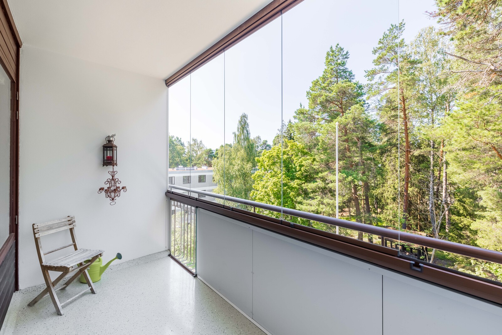 Tässä asunnossa on selkeäpohjainen pohjaratkaisu. Valoisassa keittiössä on hyvin säilytystilaa ja tilaa ruokailuryhmälle. Olohuoneen jatkeena on lasitettu parveke, josta on rauhalliset ja metsäiset näkymät.