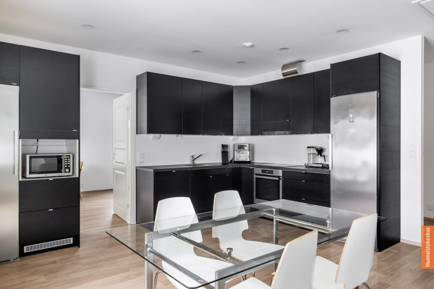 Kodin sydän on näyttävä, musta avokeittiö, joka yhdistyy saumattomasti valoisaan olohuoneeseen. Keittiö on varustettu laadukkailla kodinkoneilla ja se tarjoaa runsaasti laskutilaa kokkailuun. Olohuoneen suuret ikkunat ovat takapihan suuntaan ja tuovat tilaan reilusti luonnonvaloa. Olohuone ja keittiö onkin samaa avaraa tilaa ja molemmista on käynti tulevalle terassille, joka on katettu.