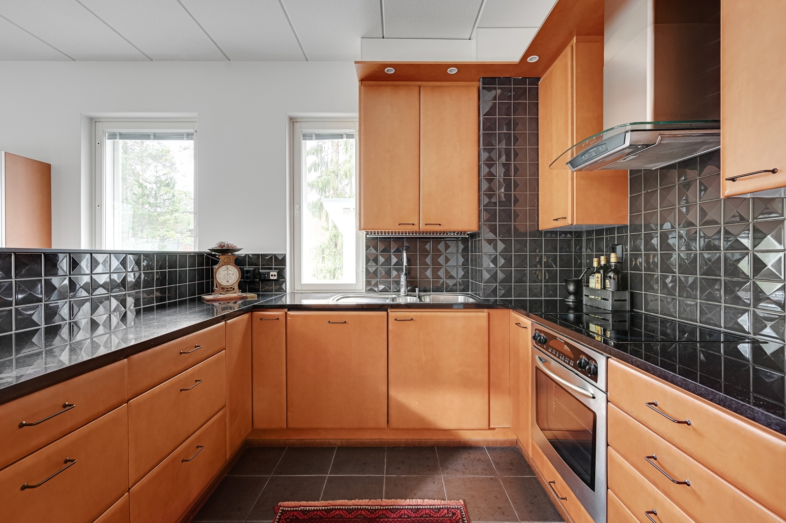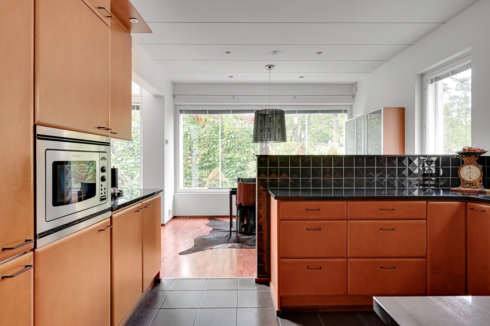 | Keittiön kuvaus | Liesi (Keraaminen liesi ja erillisuuni), työtasot (kivi), lattiat (laatta), jääkaappipakastin, astianpesukone, mikroaaltouuni, erillisuuni ja liesituuletin / hormi |