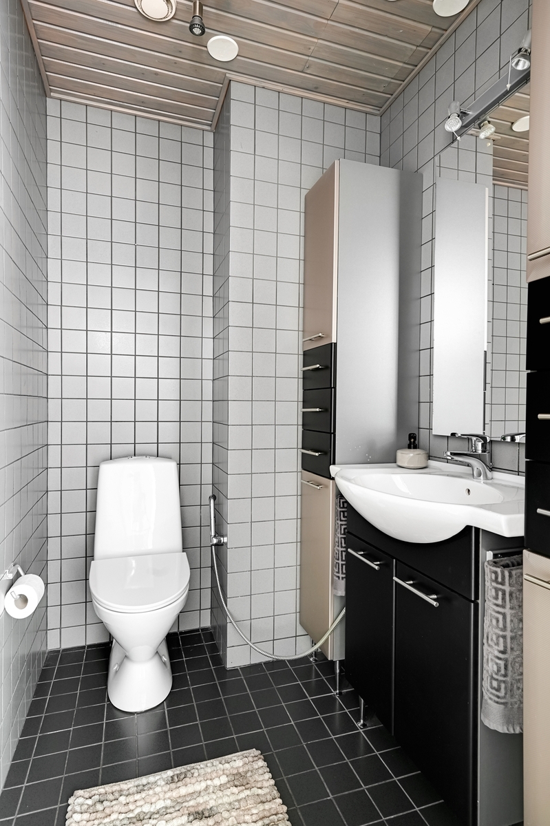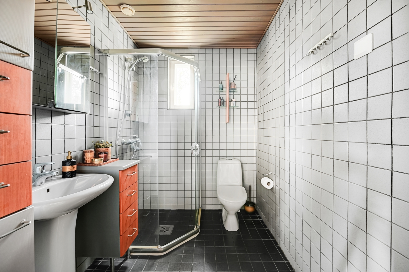 | Kylpyhuoneen kuvaus | Lattialämmitys ja suihku, seinät (kaakeli), lattiat (laatta) |
