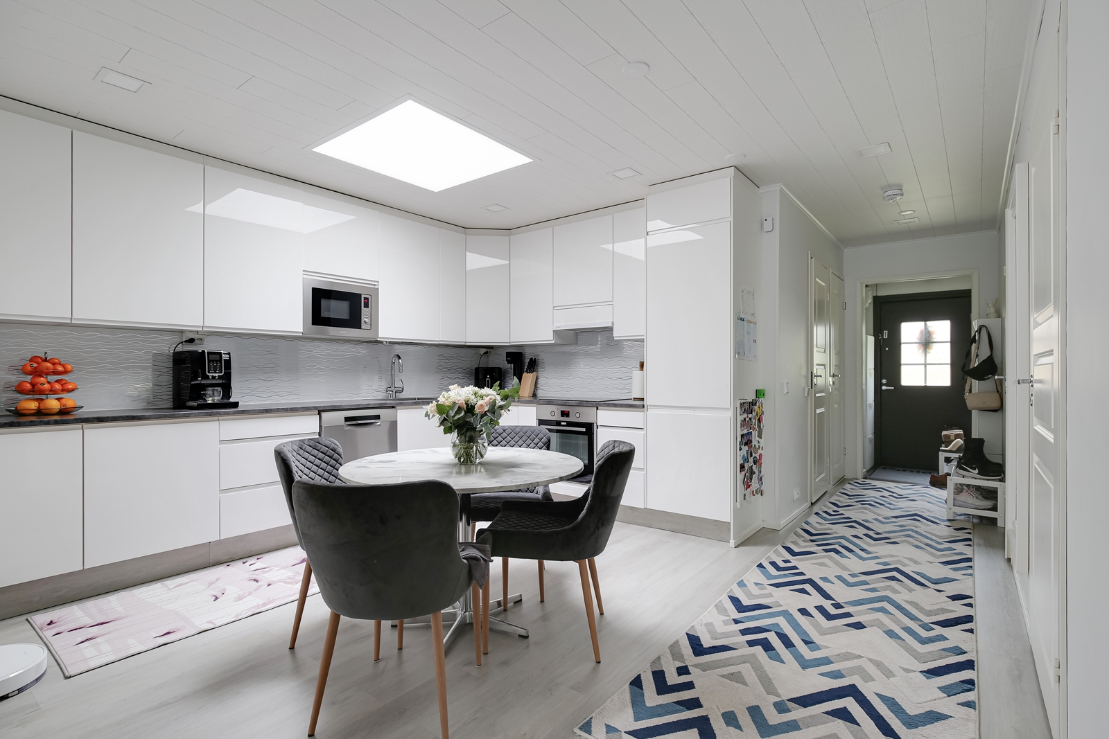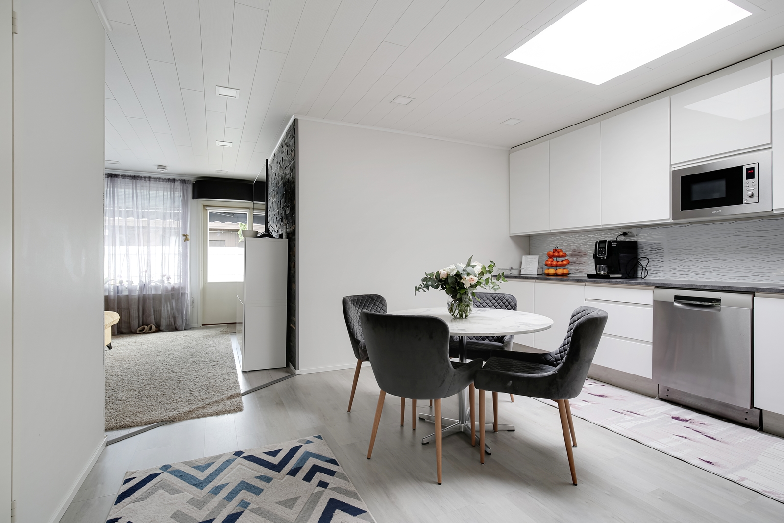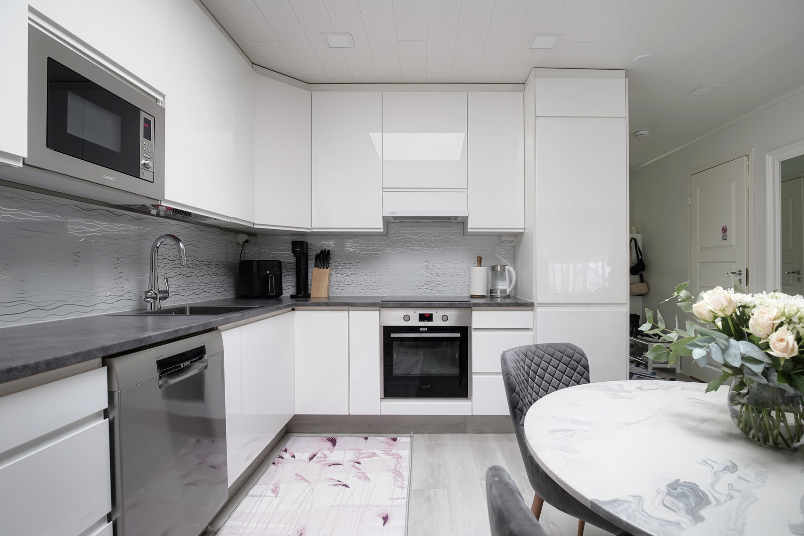 Asunnon keittiö ja pinnat on remontoitu hyvällä maulla ja laadukkailla materiaaleilla, joten tänne voit muuttaa ilman remonttihuolia. Tyylikäs ja käytännöllinen keittiö tarjoaa runsaasti säilytystilaa, integroidut kodinkoneet ja miellyttävän työskentely-ympäristön kokkailuun. Lattia- ja seinäpinnat ovat kauttaaltaan siistissä kunnossa ja kodin yleisilme on moderni mutta lämminhenkinen.