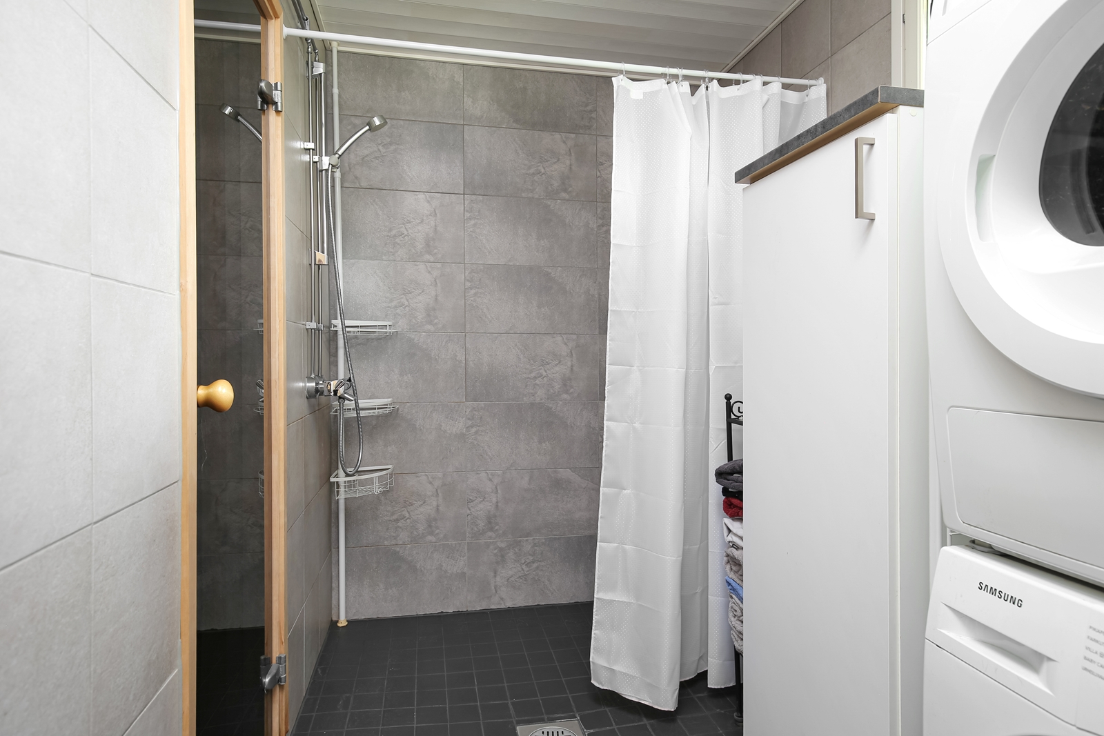 | Kylpyhuoneen kuvaus | Pesukone, kuivausrumpu, lattialämmitys ja kylpyhuonekaapisto, seinät (kaakeli), lattiat (laatta) |