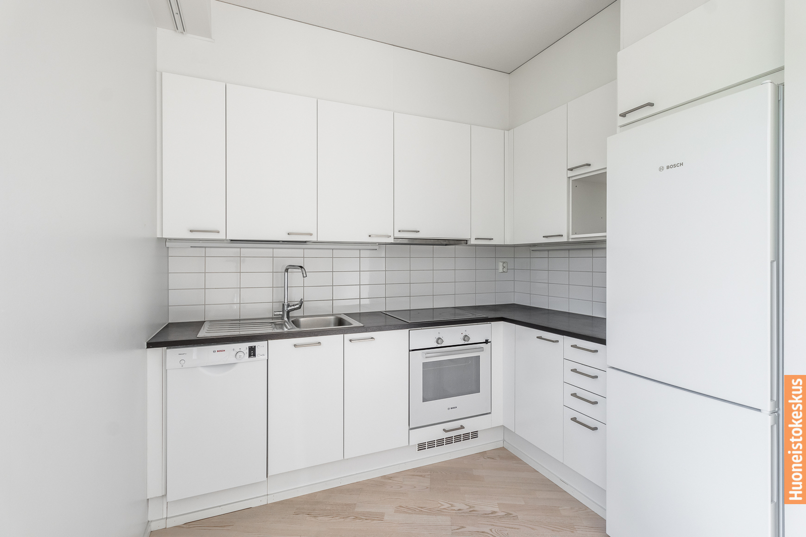 | Keittiön kuvaus | Liesi (sähköliesi, erillisuuni), liesi, jääkaappipakastin ja erillisuuni, valkoiset kaapistot |