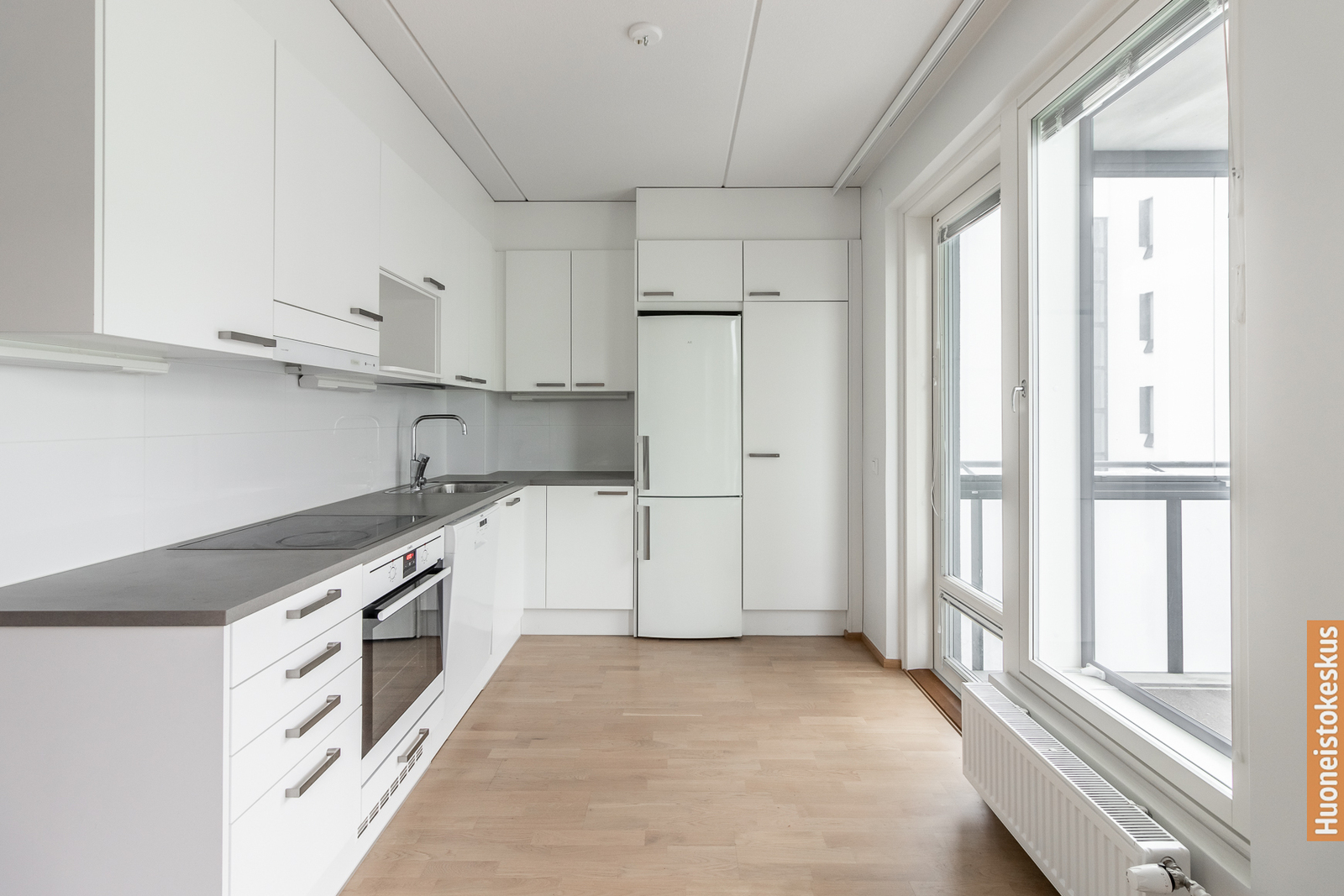 Liesi (Keraaminen liesi ja erillisuuni), seinät (maali), lattiat (laminaatti), erillisuuni, jääkaappipakastin, liesituuletin, astianpesukone ja kiinteät valaisimet |
