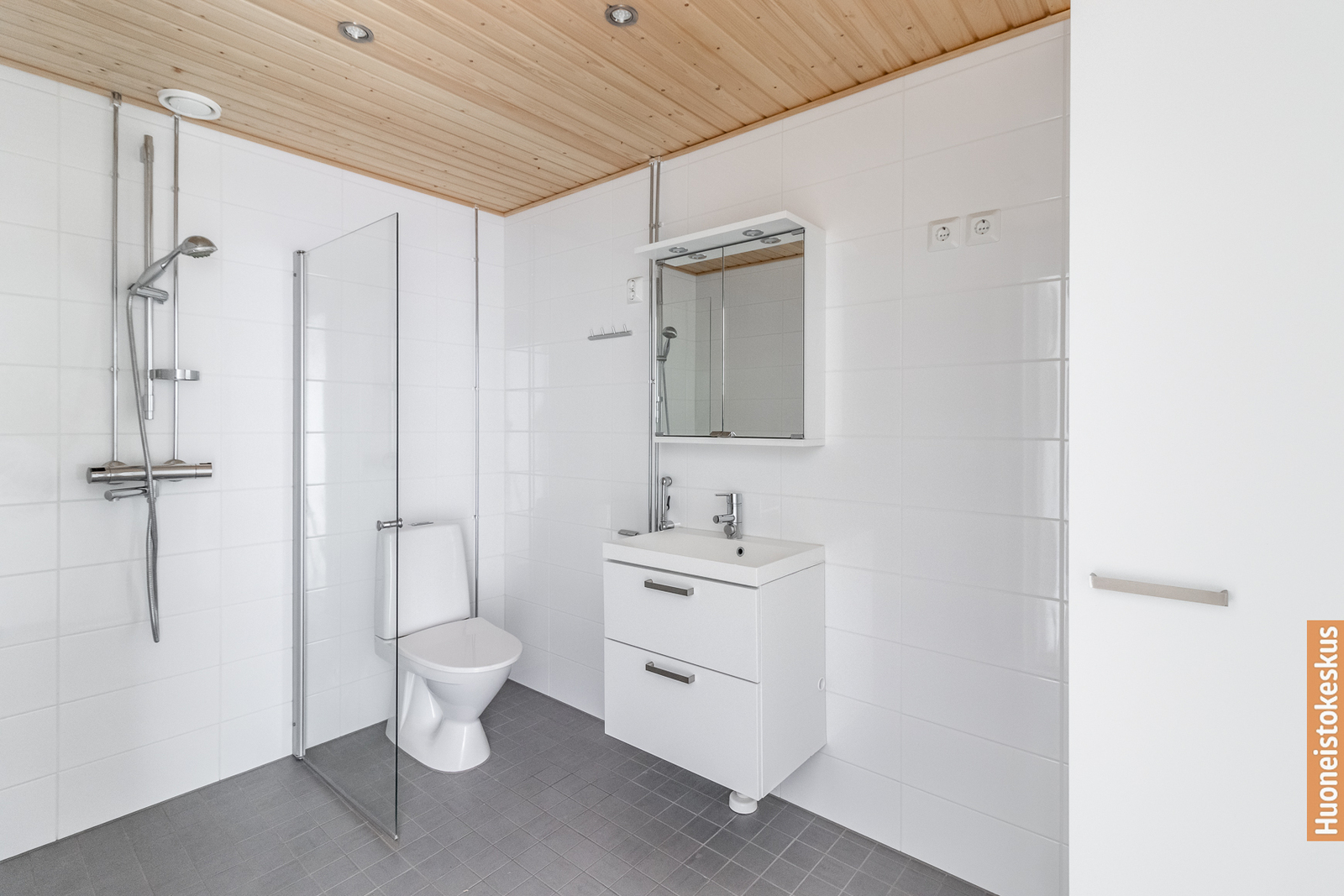 Suihku, allaskaappi, lattialämmitys, suihkuseinä, wc-istuin, peilikaappi, pesukoneliitäntä ja kiinteät valaisimet, seinät (kaakeli), lattiat (laatta) |