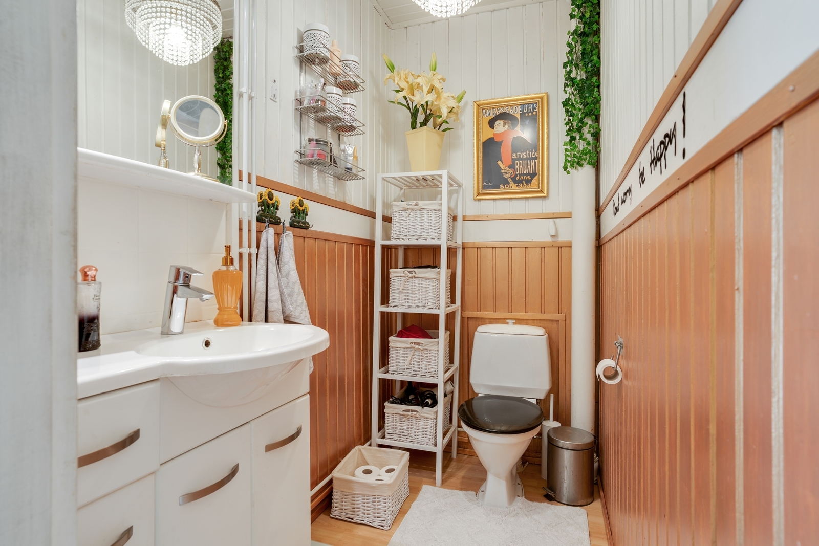 Kylpyhuone ja puulämmitteinen tilava sauna on remontoitu muutamia vuosia sitten. Talossa on myös kodinhoitohuone omalla sisäänkäynnillä. Vehreällä tontilla on varastorakennus sekä leikkimökki.