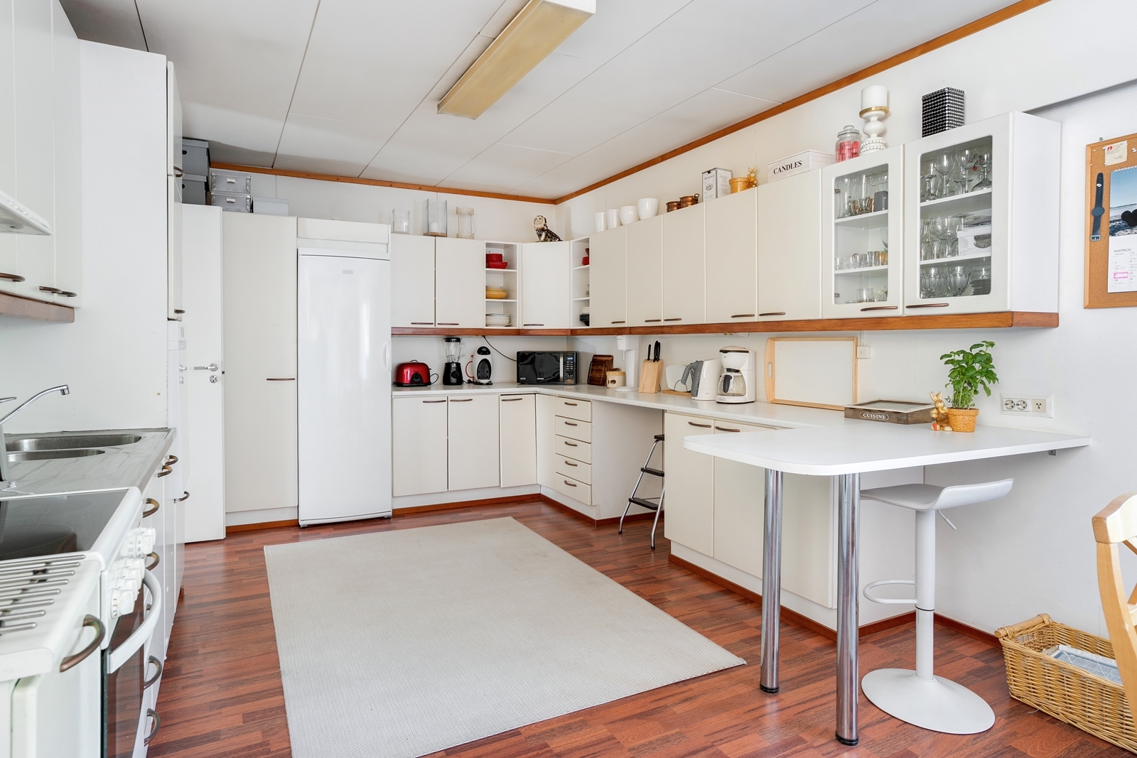 | Keittiön kuvaus | Liesi (Keraaminen liesi ja leivinuuni), työtasot (laminaatti ja metalli), seinät (maali), lattiat (laminaatti), jääkaappi, erillinen pakastin, liesituuletin, astianpesukone, uuni ja kiinteät valaisimet |