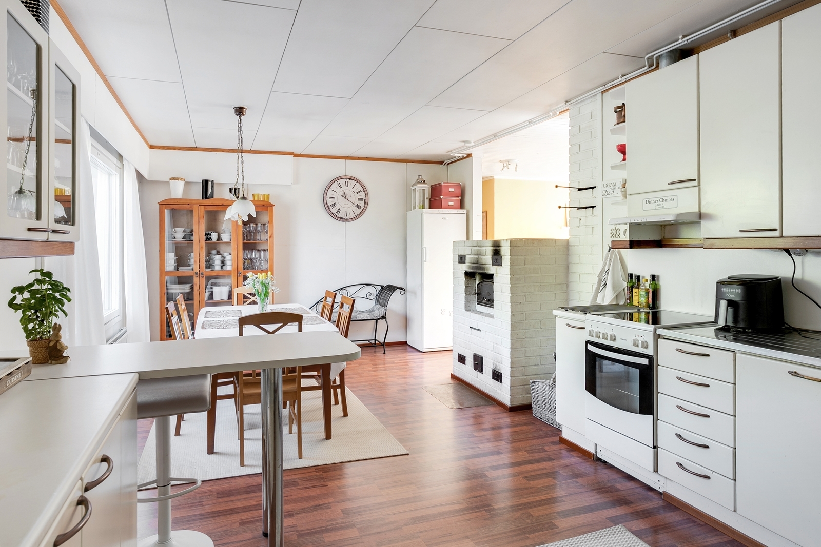 Talossa on kolme makuuhuonetta sekä keskellä avara noin 60 neliömetrin tila, joka käsittää tilavan keittiön, ruokailutilan ja olohuoneen. Sen keskellä on avotakka ja varaava leivinuuni.
