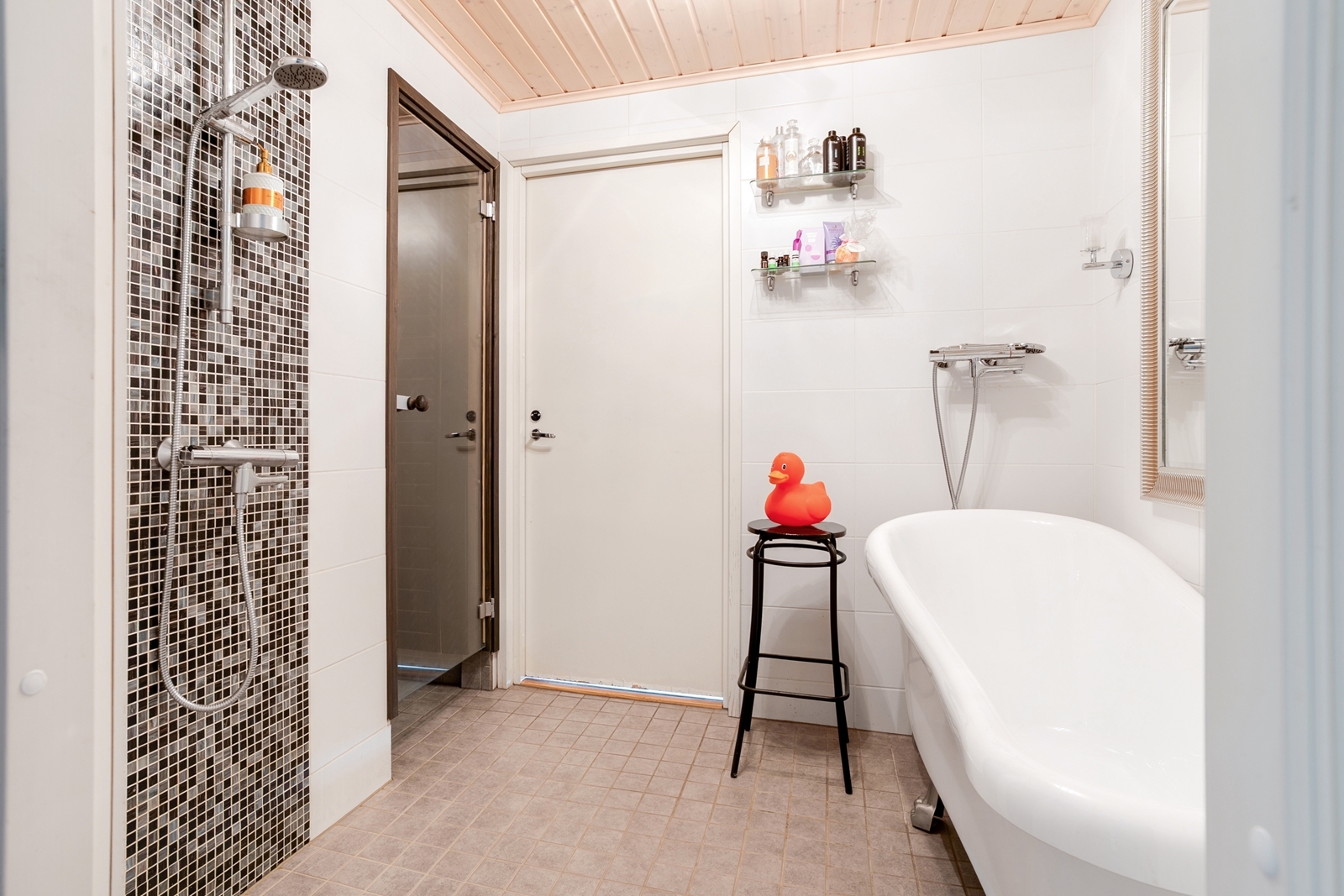 | Kylpyhuoneen kuvaus | Lattialämmitys, kylpyamme, suihku ja kiinteät valaisimet, seinät (kaakeli), lattiat (laatta) |