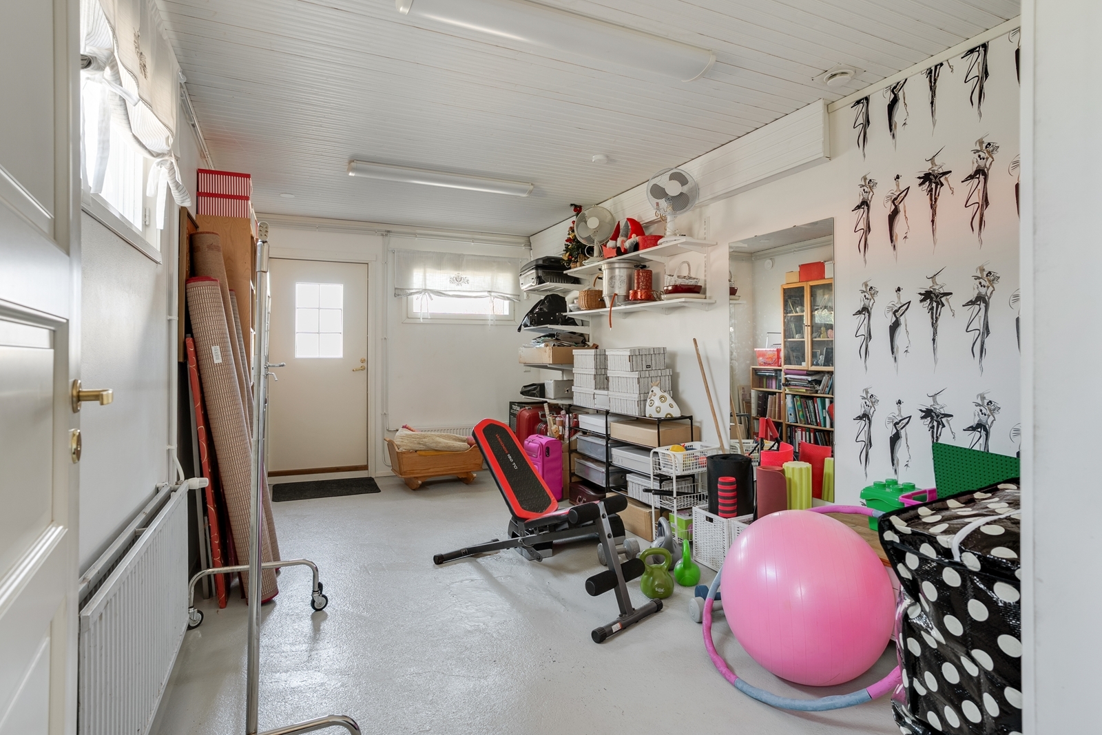 Talossa on peräti neljä sisäänkäyntiä. Yksi niistä johtaa entisestä autotallista muokattuun itsenäiseen lämpimään tilaan, joka voi toimia harrastehuoneena, vierasasuntona, yritystilana tai vaikkapa teinin “siirtymäasuntona”.