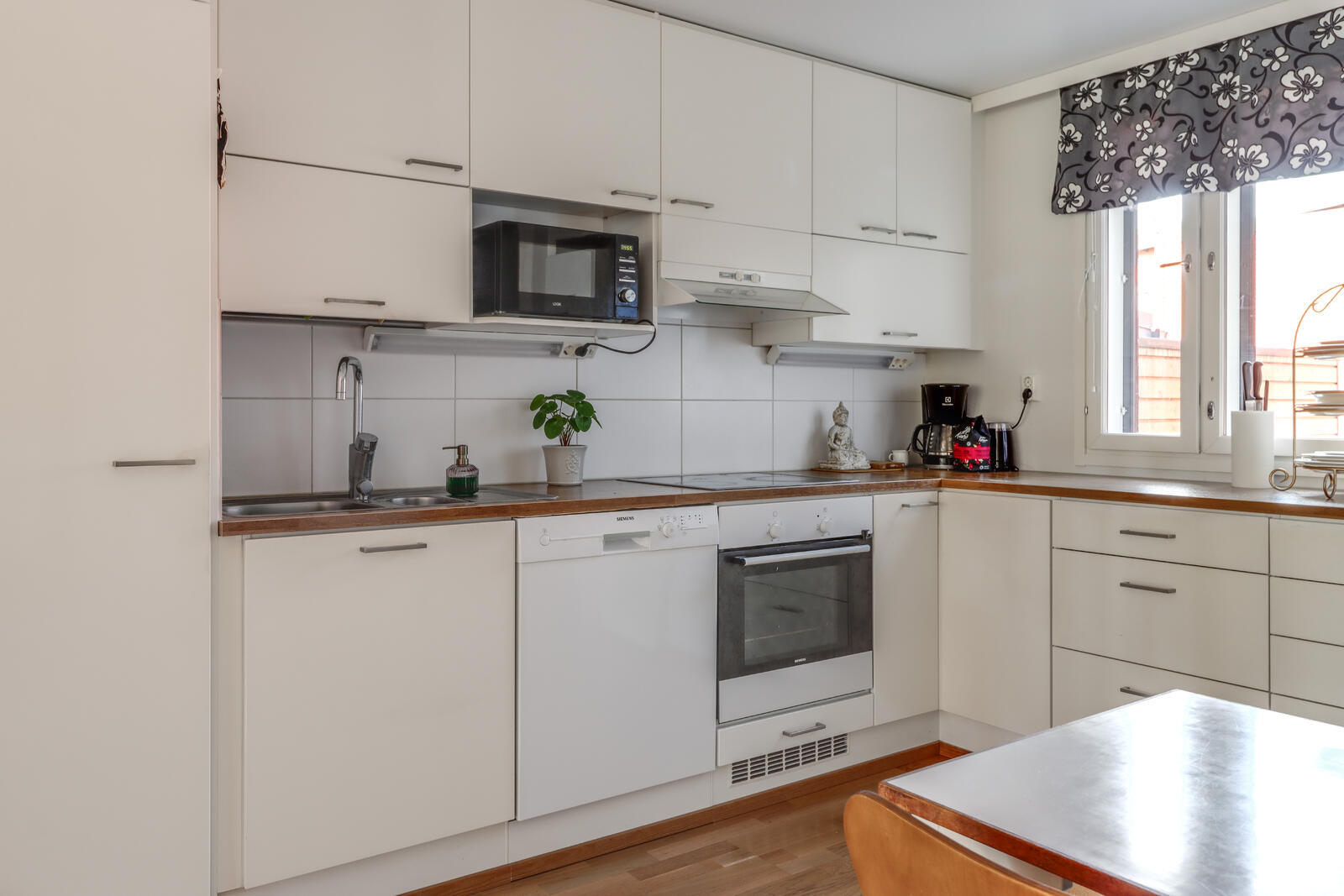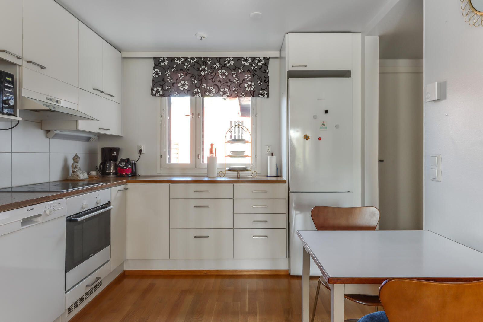 | Keittiön kuvaus | Liesi (liesitaso, muu), työtasot (laminaatti), seinät (maali), lattiat (parketti), astianpesukone, jääkaappipakastin, liesi ja kiinteät valaisimet, liesitaso, liesituuletin / hormi |