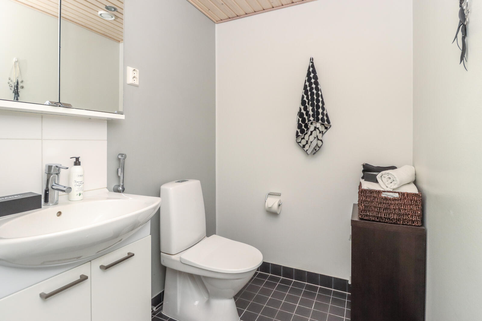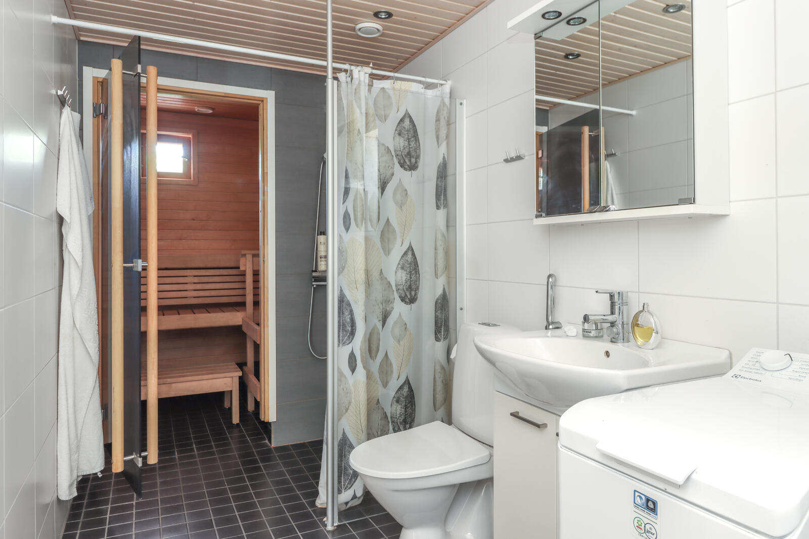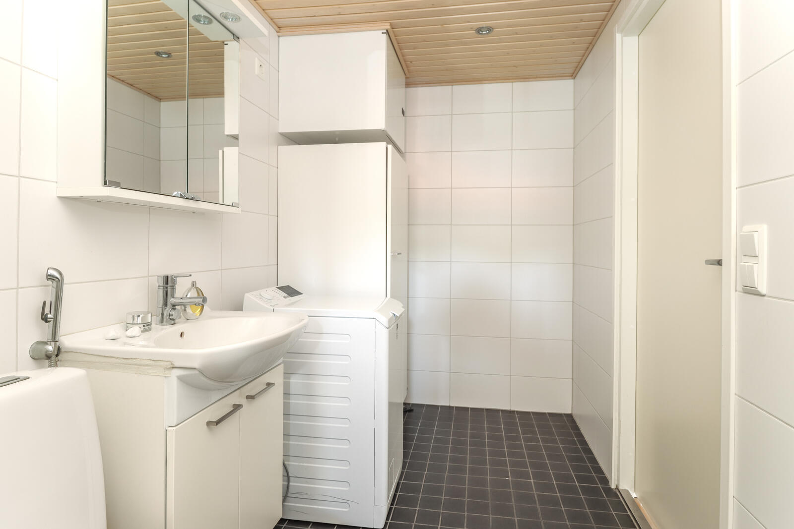 | Kylpyhuoneen kuvaus | Allaskaappi, pesukoneliitäntä, lattialämmitys, peilikaappi ja kiinteät valaisimet, seinät (kaakeli), lattiat (laatta) |