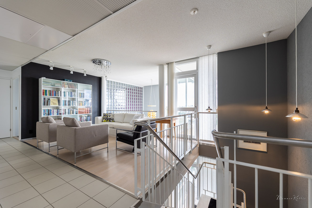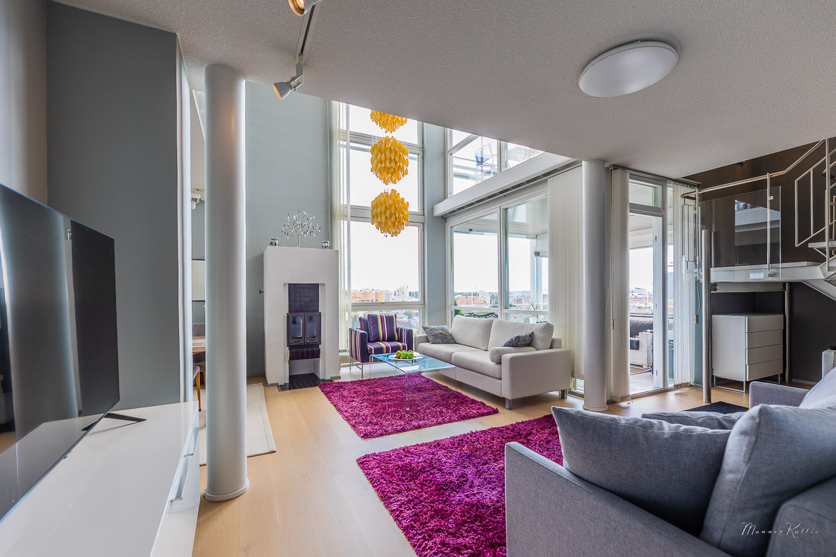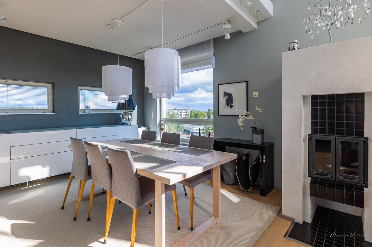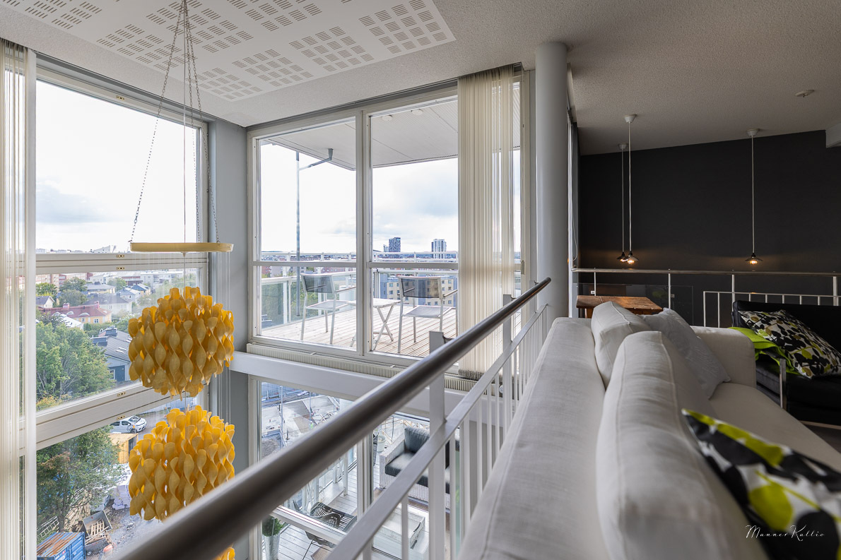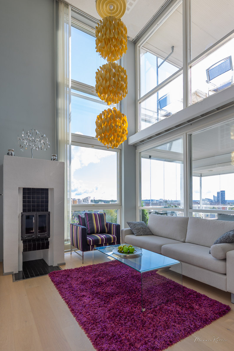 Tämä laadukkaasti rakennettu ja erinomaisessa kunnossa pidetty koti tarjoaa avaruutta ja asumismukavuutta vaativampaankin makuun. Kahden kerroksen korkuiset ikkunat olohuoneessa ja yläkerran aulatilassa tarjoavat valoa ja huikeat näkymät Tampereelle. Olohuoneen huonekorkeus n. 5,6 metriä! Viilennysilmastoinnin ansiosta asunto pysyy myös aurinkoisina kesäpäivinä mukavan viileänä. Asunnossa on tehty kattavasti remontteja, ja yleisilme on kauttaaltaan siisti ja moderni – voit muuttaa suoraan ilman remonttihuolia. Huoneistolla ei ole seinänaapureita.