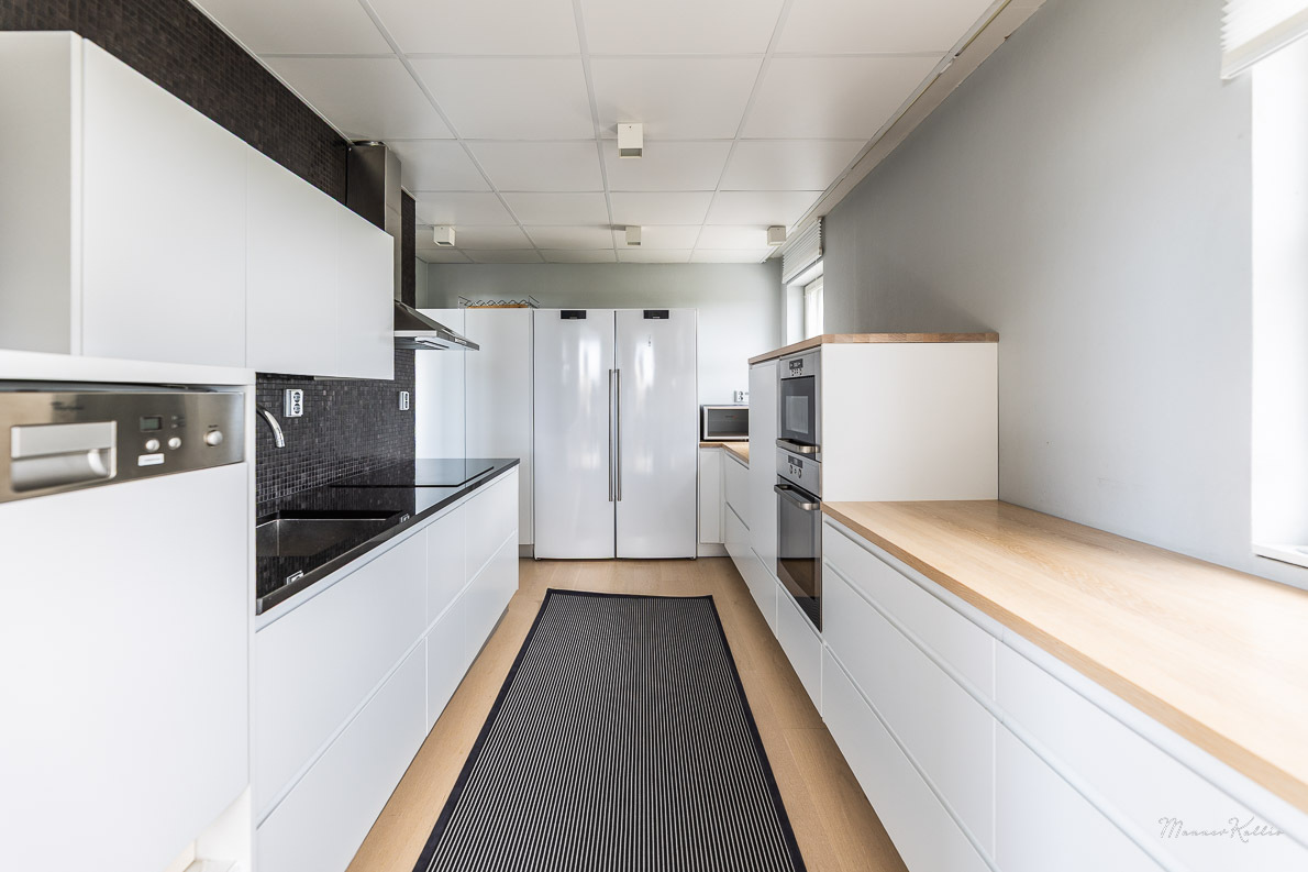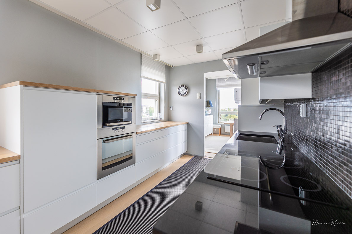 | Keittiön kuvaus | Liesi (Induktioliesi ja erillisuuni), työtasot (puu ja kivi), seinät (laatta ja maali), lattiat (parketti), astianpesukone, erillisuuni, mikroaaltouuni, jääkaappi, erillinen pakastin, liesi ja kiinteät valaisimet, liesituuletin / hormi |