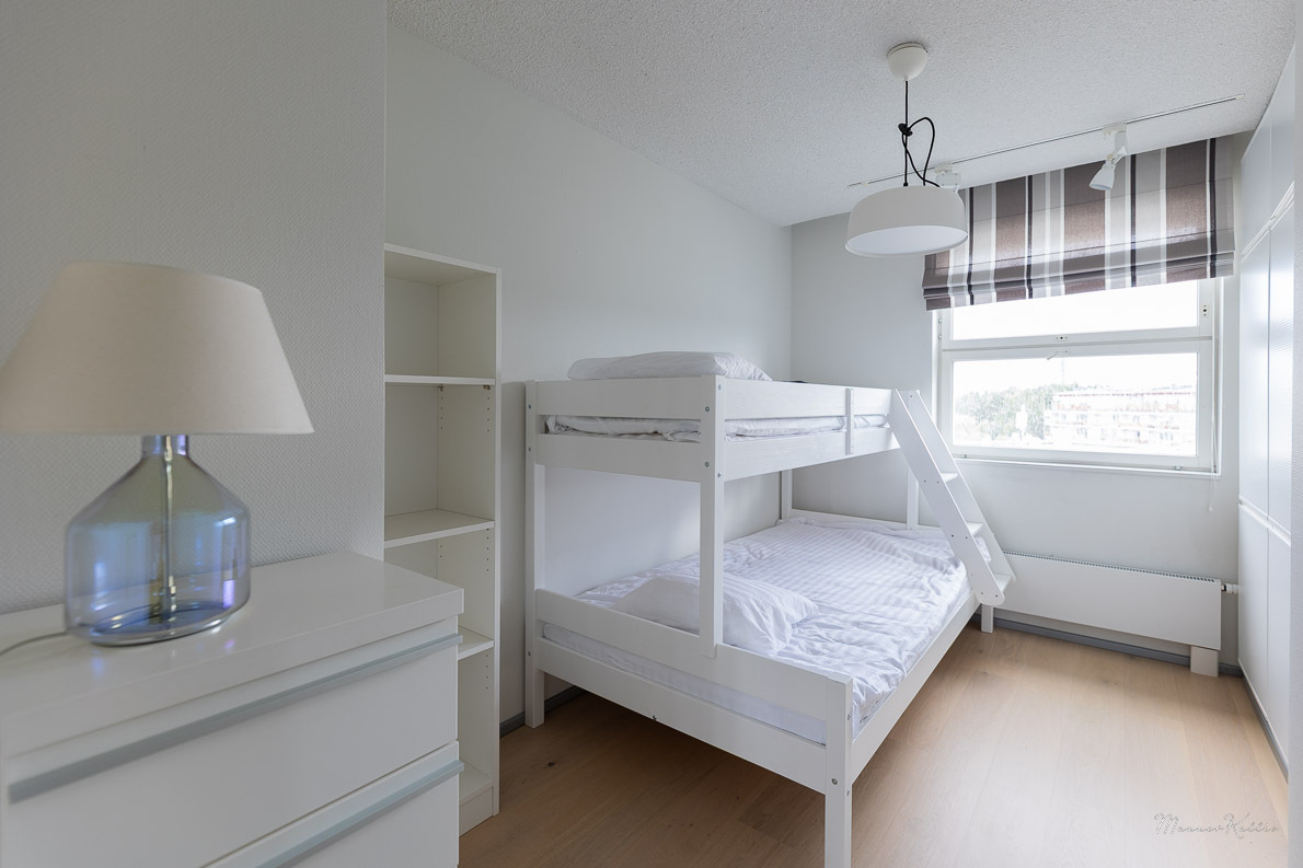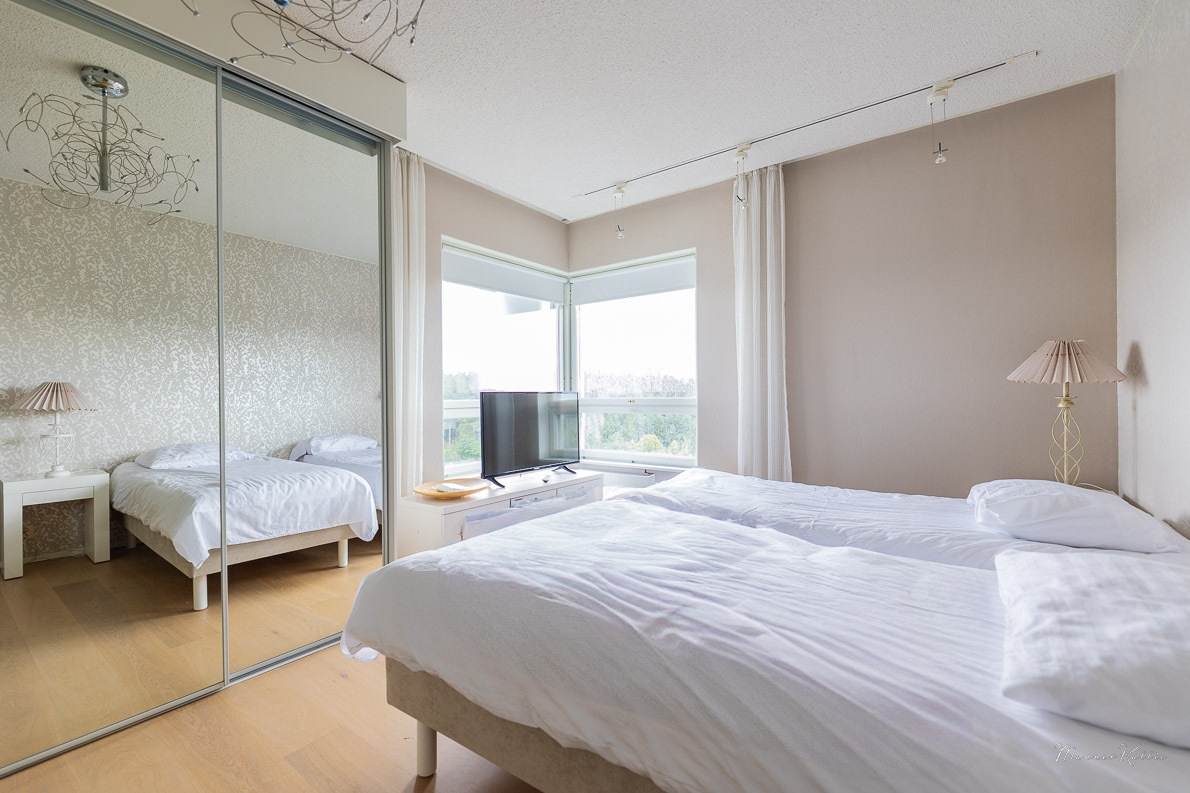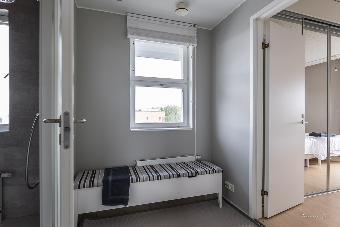 | Makuuhuoneen kuvaus | Lukumäärä: 4, Alakerran pieni makuuhuone Lattia: parketti Seinät: lasikuitutapetti ja maalattu Katto: maalattu Valokisko Kaapisto Alakerran iso makuuhuone Lattia: parketti Seinät: maalattu Katto :maalattu Valokisko Peililiukuovikaapisto Yläkerran iso makuuhuone, kulku kylpyhuoneeseen Lattia: parketti Seinät: maalattu Katto :maalattu Valokisko Peililiukuovikaapisto Yläkerran pienempi makuuhuone Lattia: vinyylilankki Seinät: lasikuitutapetti, maalattu ja lasitiili Katto: maalattu Valokisko Kaapisto |