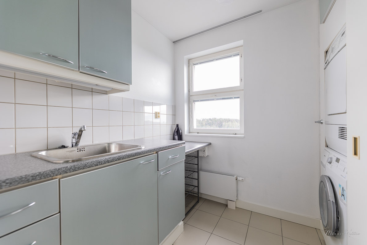 | Kodinhoitohuoneen kuvaus | Kuivauskaappi, pesuallas, kuivausrumpu, pesukoneliitäntä, pöytätaso ja pesukone, lattiat (laatta), seinät (lasikuitutapetti ja kaakeli) |