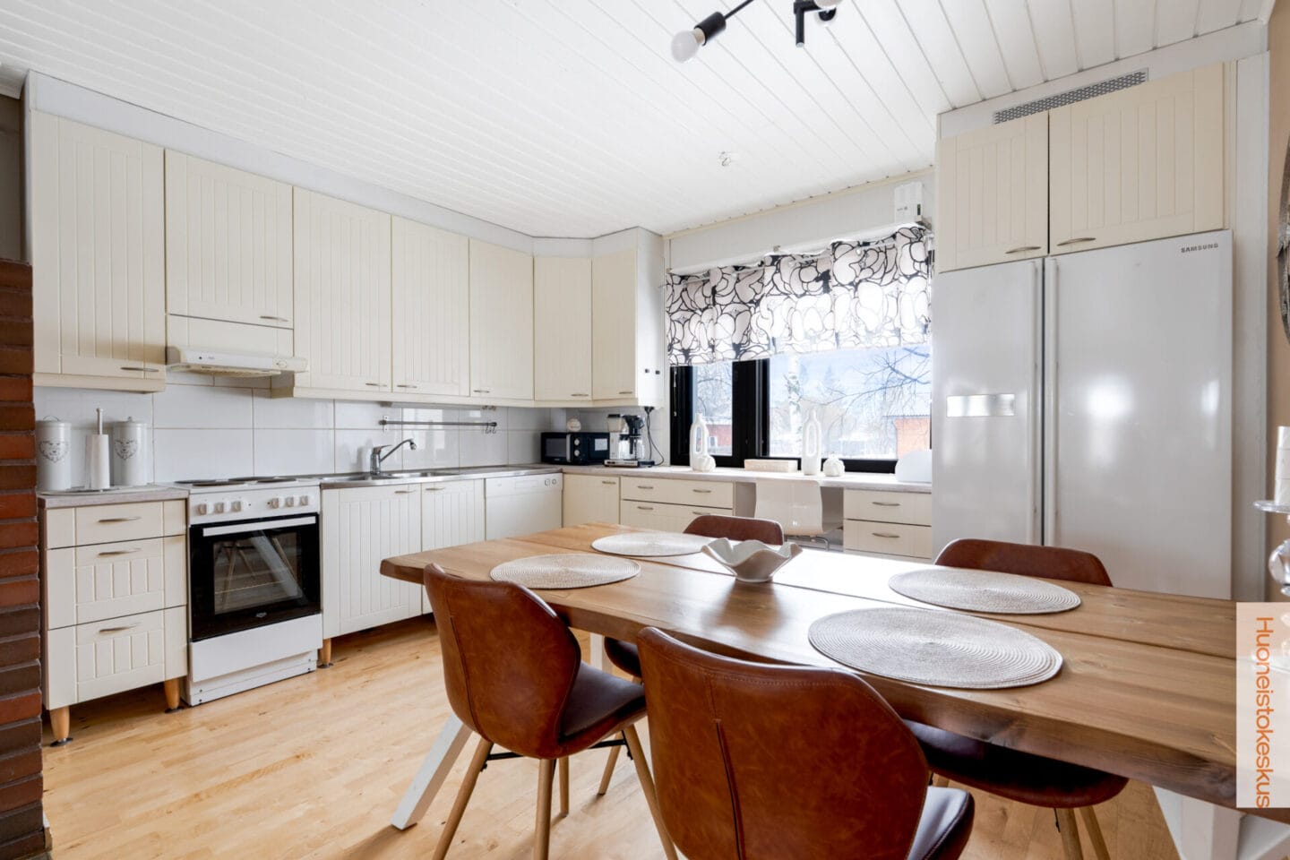 | Keittiön kuvaus | Liesi (Sähköhella), työtasot (puu), seinät (maali ja tapetti), lattiat (parketti), astianpesukone, jenkkikaappi, liesituuletin ja leivinuuni |