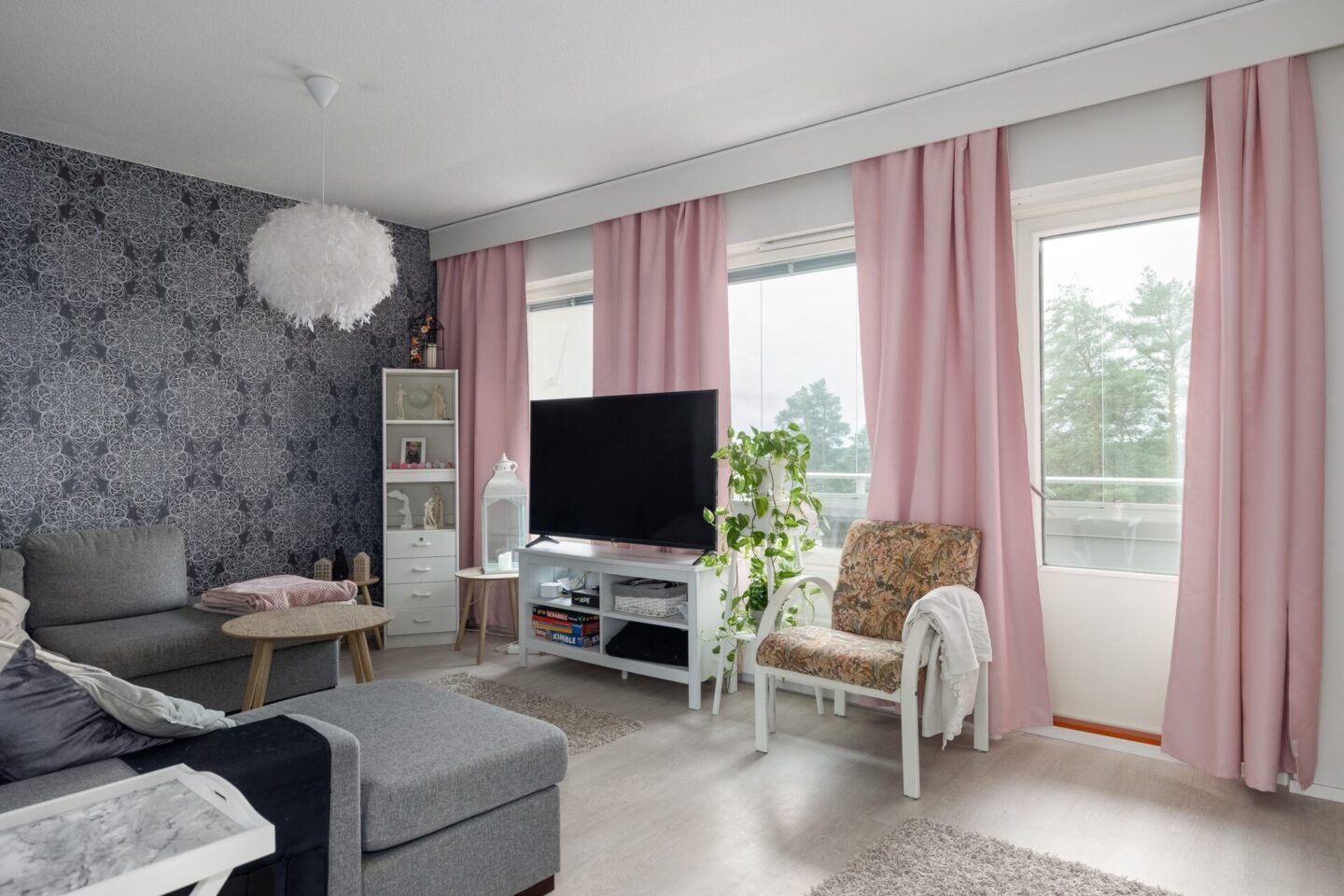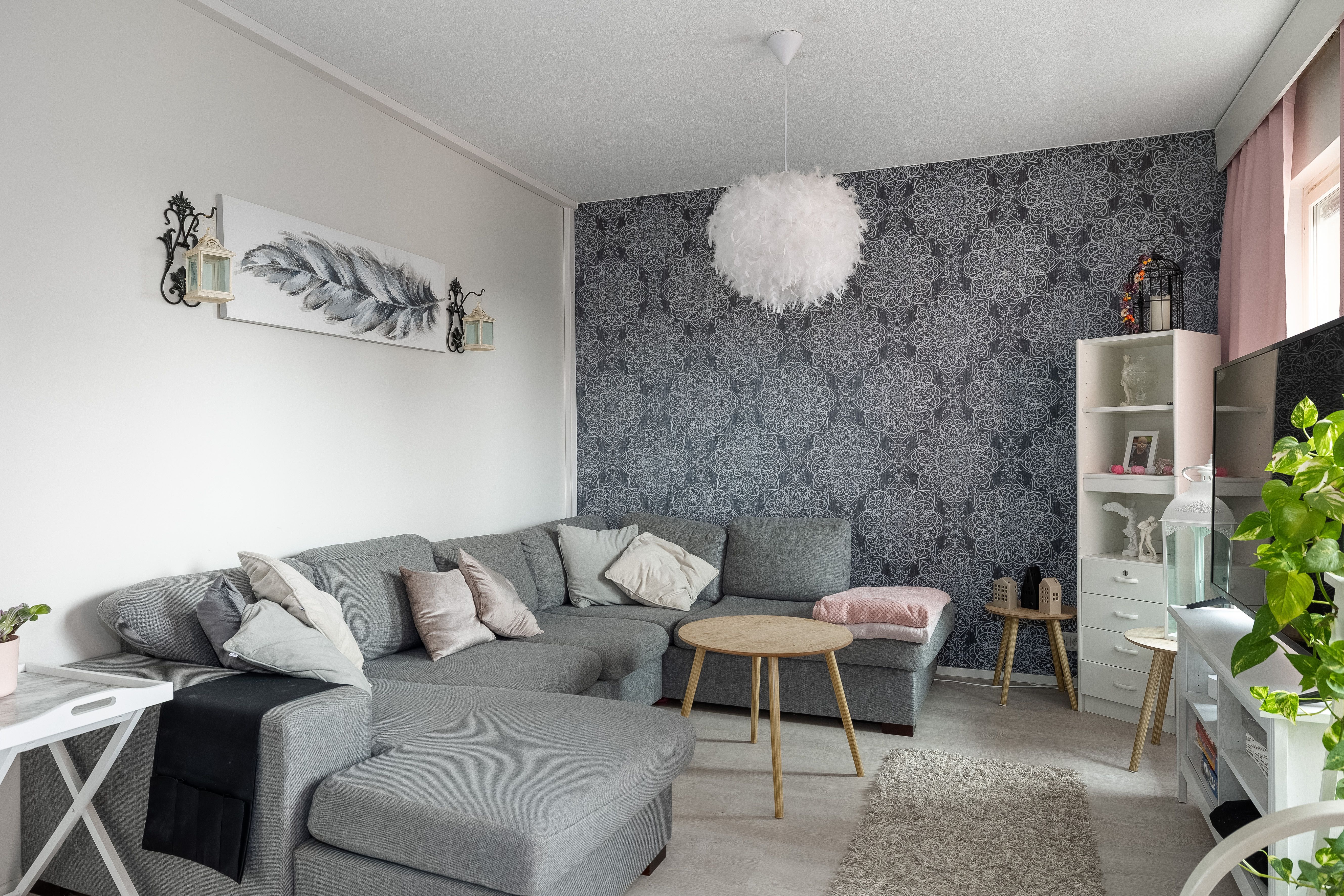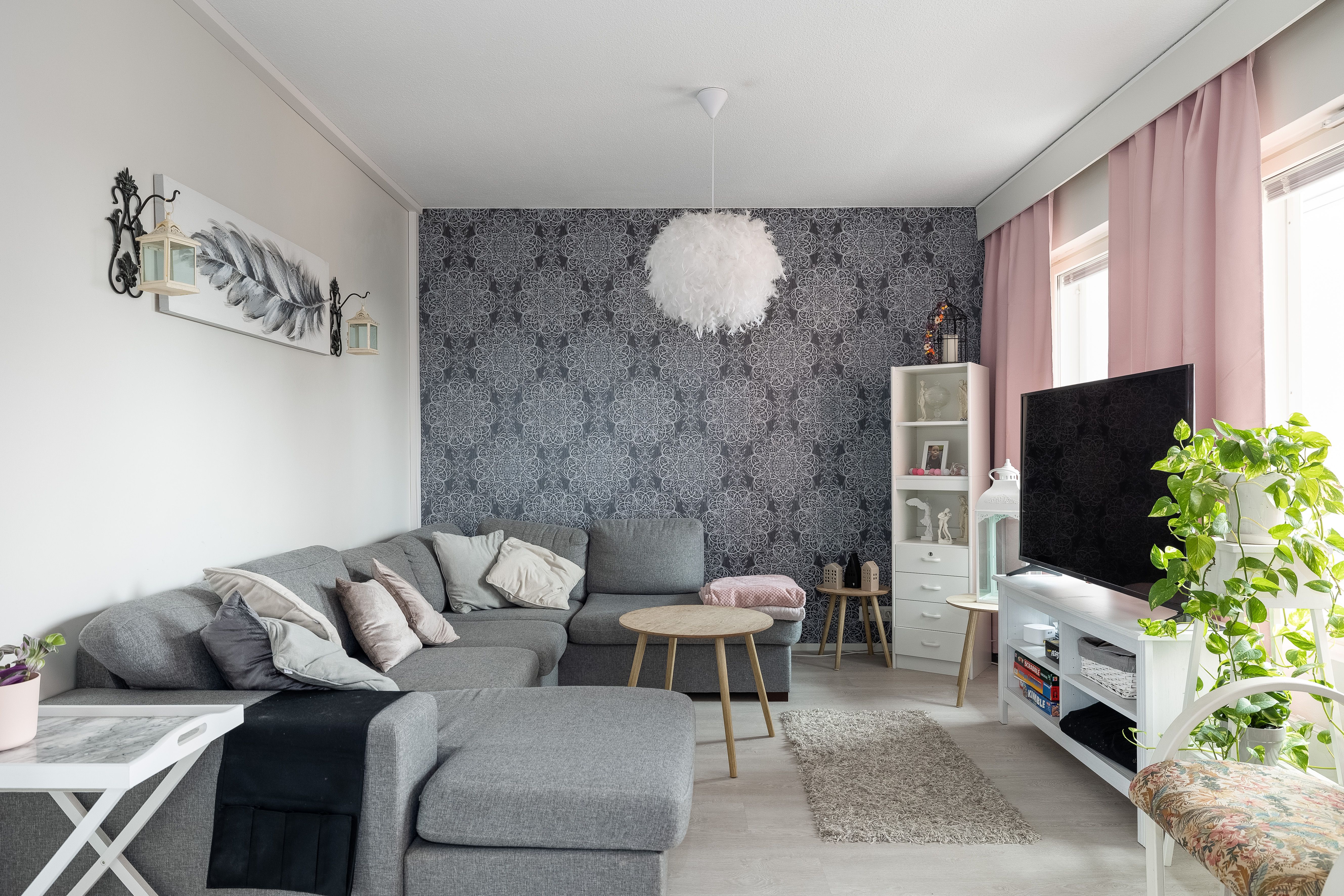 | Olohuoneen kuvaus | Seinät (maali ja tapetti), lattiat (laminaatti) |